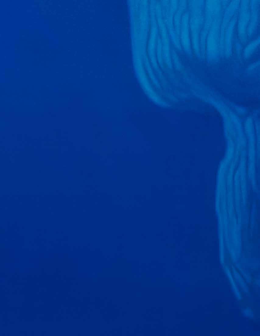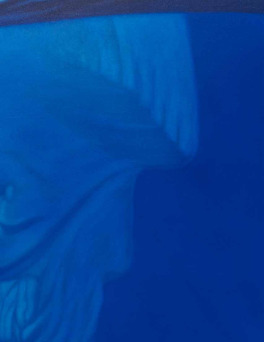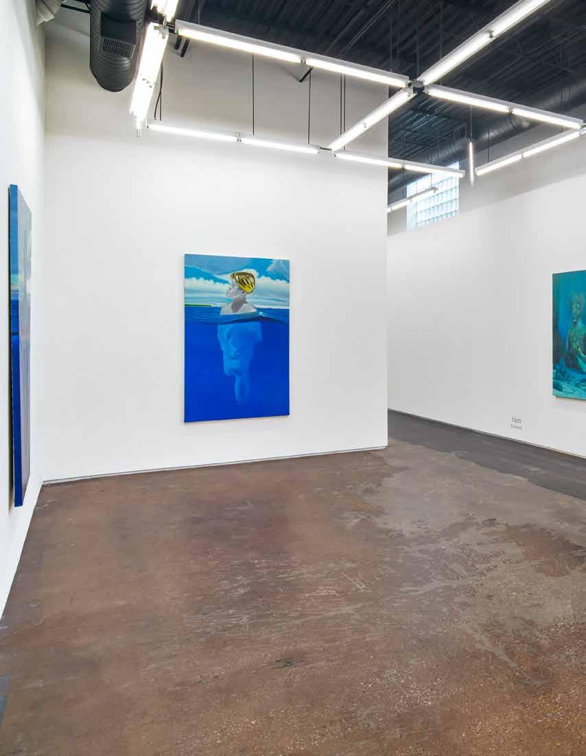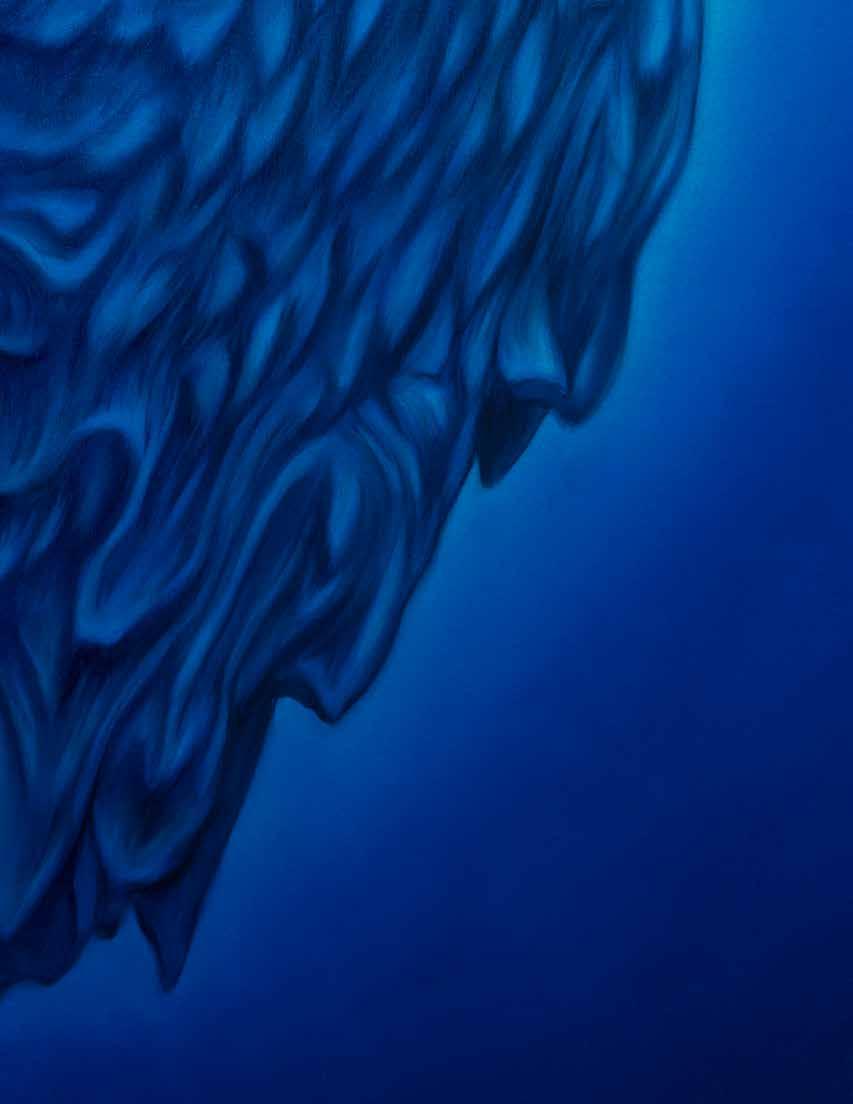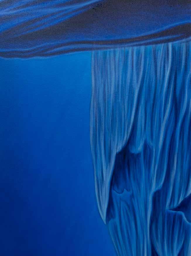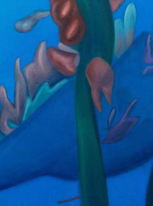 ocean floor. These deep-sea habitants occupy underwater terrains surrounded by coral reefs, swaying kelp, and rocky escarpments, patinaed and eroded by the effects of longterm submersion, skin tones rendered through thicker applications of turquoise, green, and violet oil paint. Who these subjects are, how they got here, or where they were going remains to be seen, yet the depth at which they exist suggests a connection to the relationship we have with our oceans and how little we understand of these undiscovered worlds. The ocean, emblematic of our universe with its depths equally as pitch black and silent as the cosmos, is a carrier for hidden histories.
