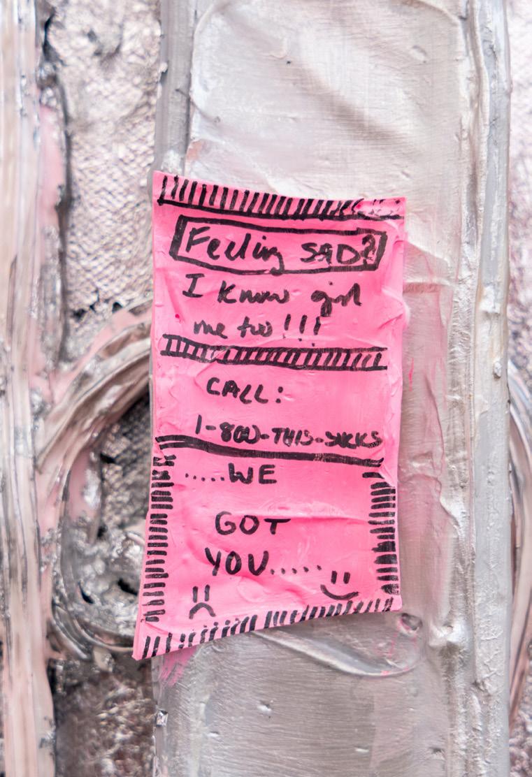 Materially, the work is sculptural and immersive. Thick piped paint, “paint skins,” textiles, rhinestones, nail charms, and domestic ephemera sourced from thrift stores are layered to build textured surfaces that blur the line between painting and installation. A custom wallpaper—based on a 1970s pattern from her childhood home—features gilded floral motifs and subtle renderings of the female reproductive system, signaling both beauty and rupture in a moment of heightened political tension surrounding women’s bodies. The exhibition also explores the politics of place, particularly the impact of gentrification on Chicago’s South Side and the erasure of culturally significant spaces. Imagined storefronts serve as speculative interventions—sites where hyperfeminine care practices are re-centered as both joyful and subversive.