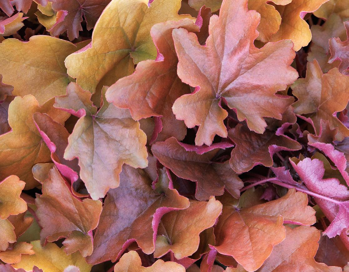The carefree spirit of the 1950s is embodied in a color palette that blends playful color with laid-back California cool. The voluminous pink blooms of Chansonette’s Blush Camellia (Zones 7-9) remind us of twirling poodle skirts, while the blue-green foliage of Krossa Regal Hosta (Zones 3-8) brings a refreshing, surfside calm. Sienna Sunrise® Heuchera (Zones 4-9) and Banana Split® Daphne (Zones 7-9) capture the warmth of a Pacific sunset with warm orange tones and a yellow glow.