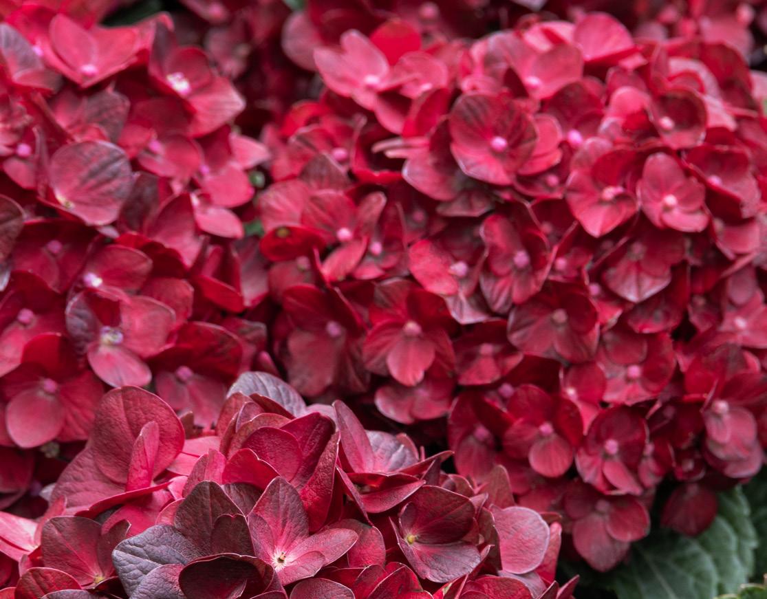 Centennial Ruby™ Hydrangea (Zones 4-9) anchors the combo with ruby-red blooms that deepen dramatically with age, and the dark foliage of Tectonic® Magma Begonia (Zones 8-11, or annual) intensifies the mood.