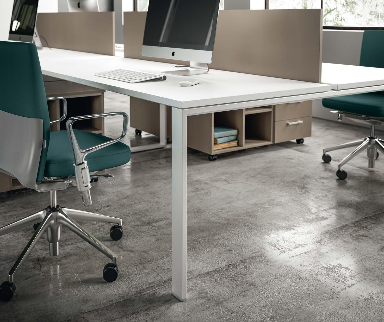 Le postazioni bench permettono di ospitare capienti mobili di servizio, freestanding o portanti, posizionandoli sotto il piano di lavoro.