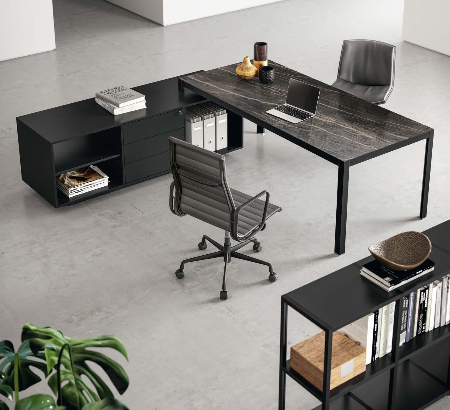 Grande polyvalence stylistique donnée par le plateau en Laminam®. Un grès précieux et innovant, idéal pour créer des projets sur mesure conçus pour s’adapter à des environnements de travail contemporains et dynamiques. Dans le bureau YOGA, une plaque de verre biseautée sert de support au plateau en Laminam®, lui offrant résistance et finissage.
