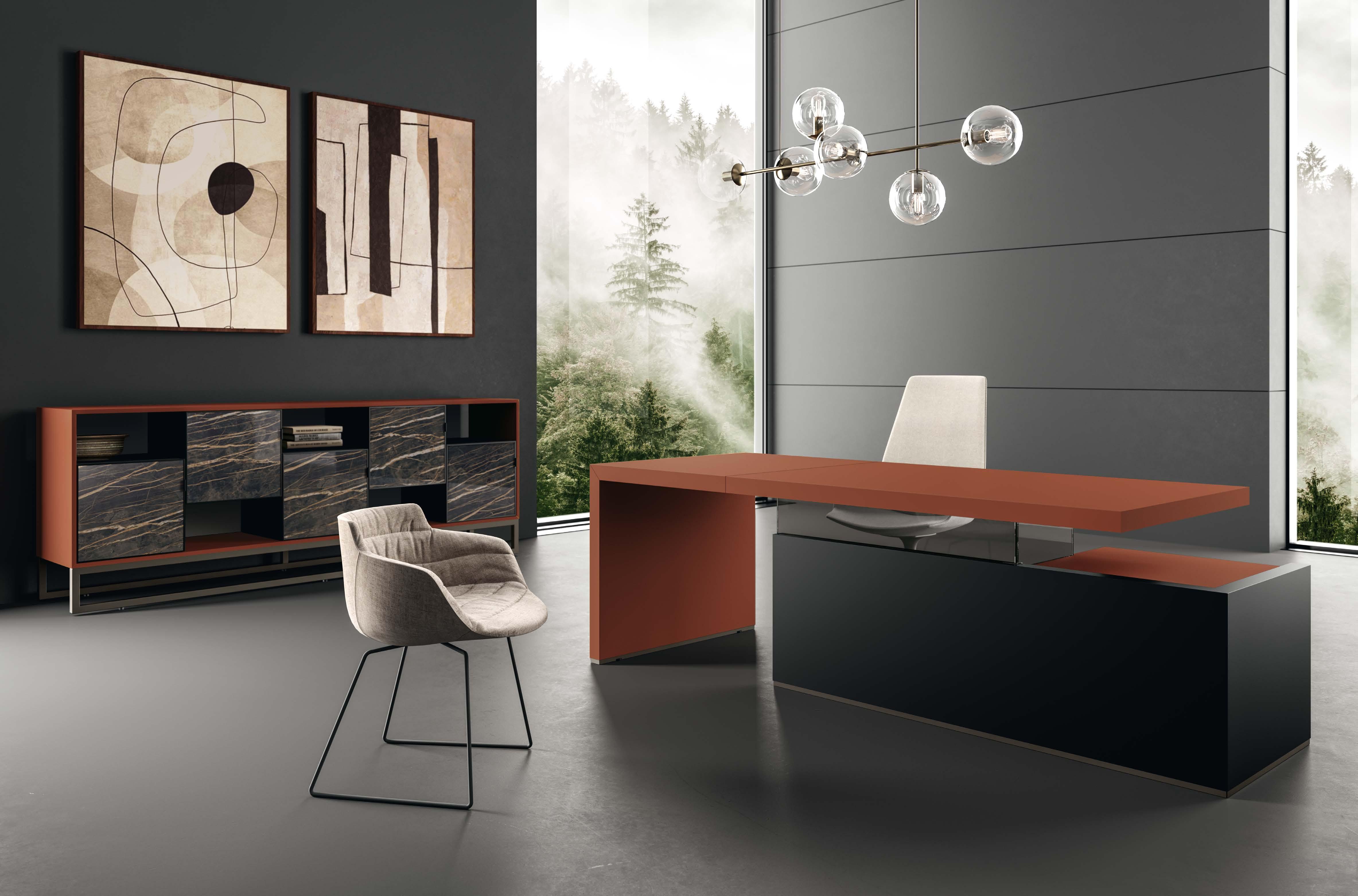 Ispirazione tratta dalla contemporaneità per dare una nuova prospettiva all’ambiente di lavoro, confortevole e di tendenza, con richiami all’arredo casa.