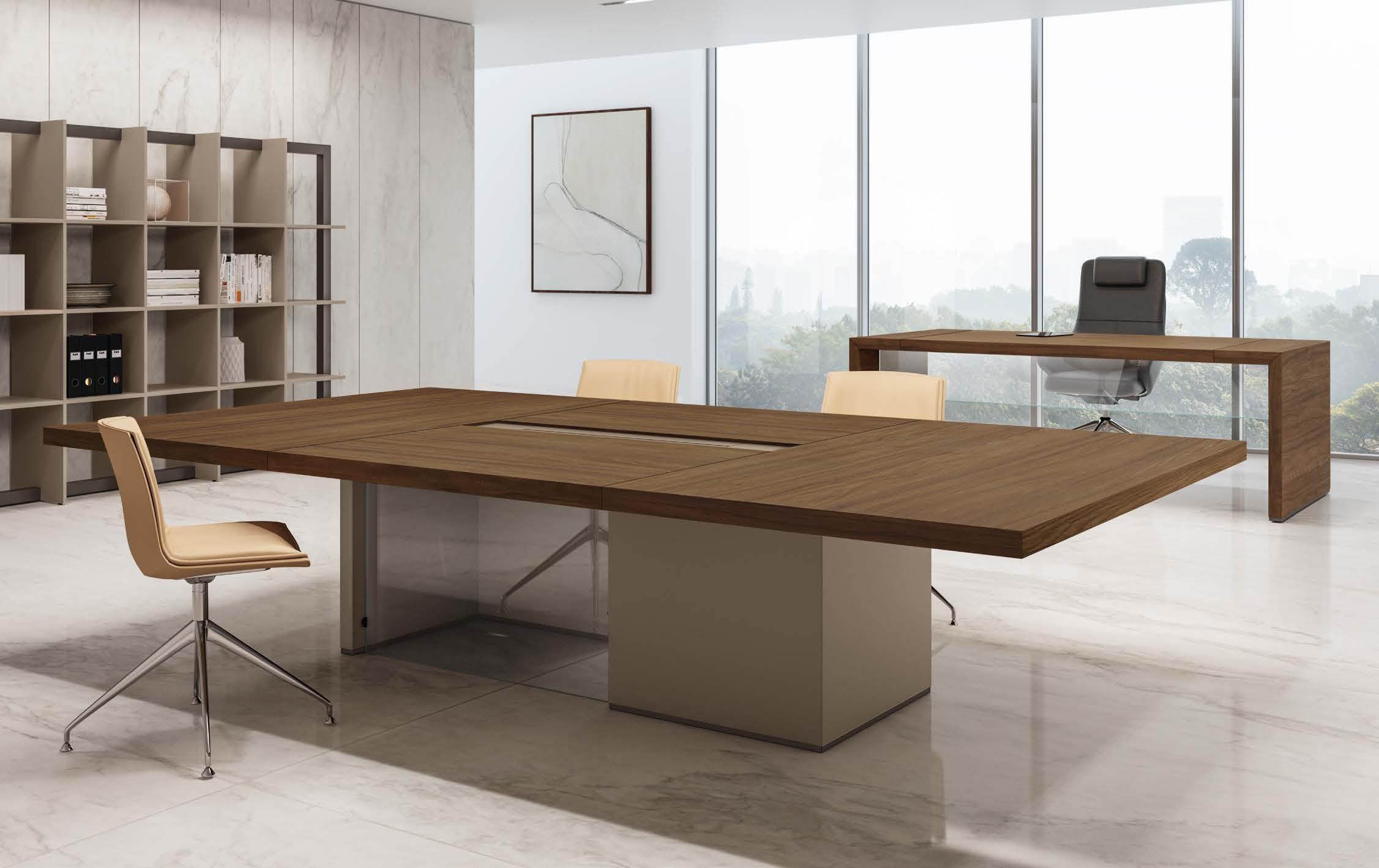 The MAGNUM meeting table, with its accentuated longitudinal development, dominates the environment with plays of volumes and contrasting finishes.