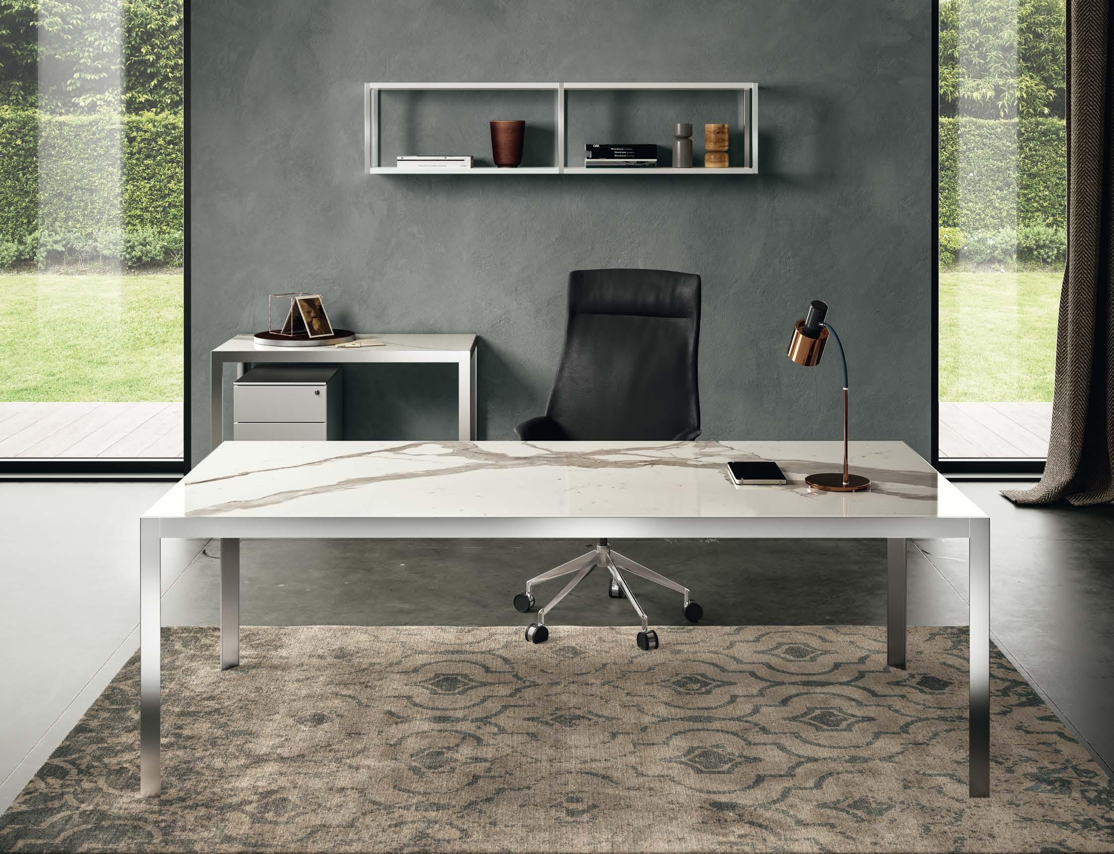 La struttura in alluminio della scrivania, frutto di un design minimal ed essenziale, viene esaltata dalle pregiate varianti per il piano di lavoro: melaminico, laccato, impiallacciato, vetro, pelle o Laminam®.