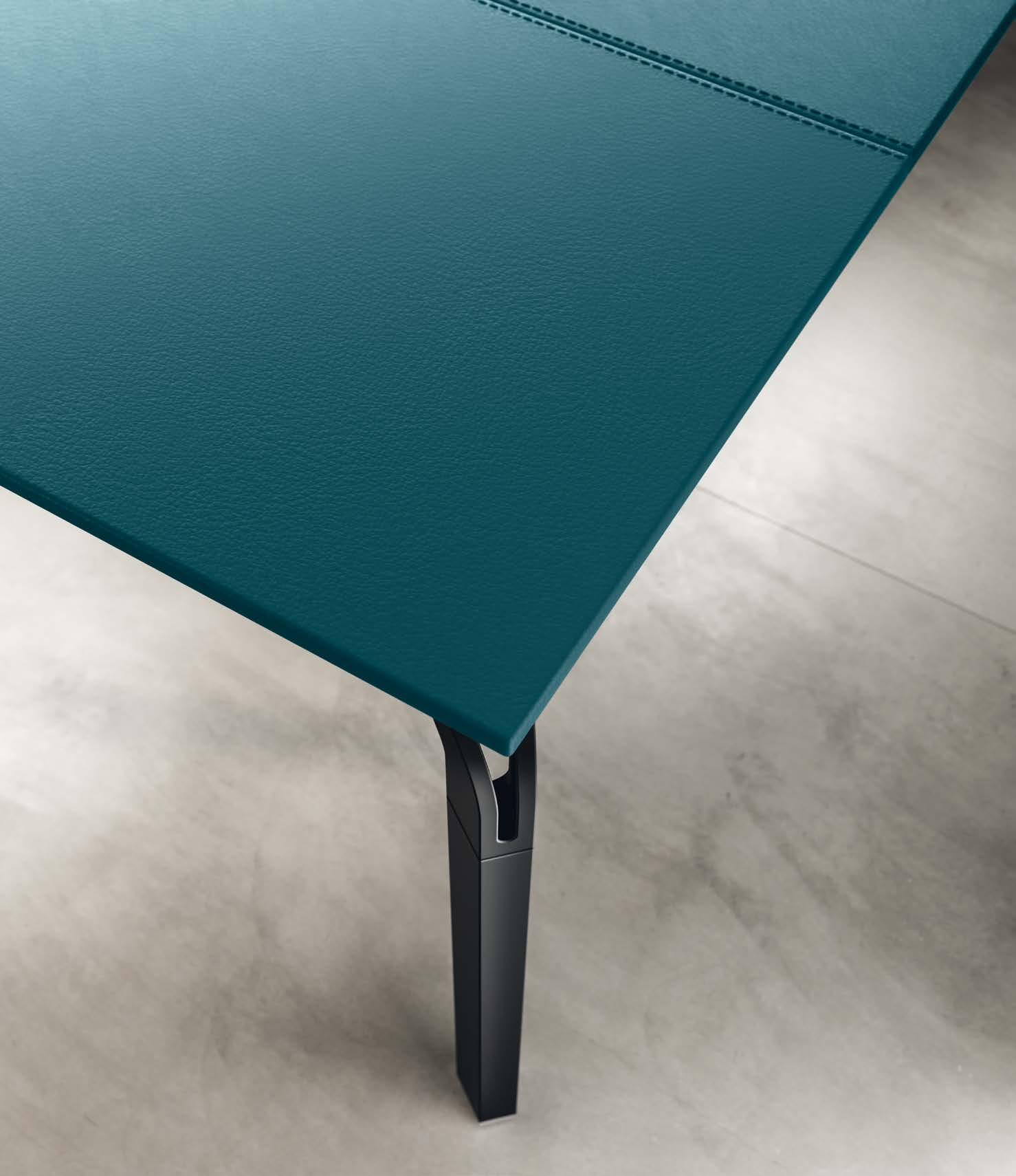 Esthétique raffinée et soin artisanal pour les plans de travail avec revêtement en cuir. Six teintes semi-mates, douces et cireuses au toucher, précieuses et élégantes à l’œil. Associées à la structure originale en aluminium, elles meublent avec classe des salles de réunion et des bureaux de représentation.