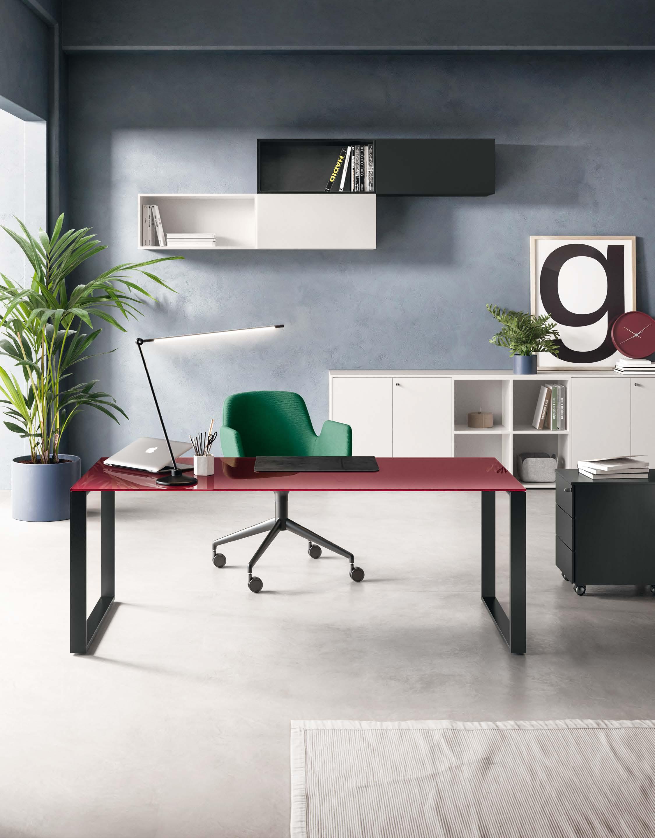 The matt finish lacquered surface takes advantage of the wide choice of colors to reflect taste, personality and sensations. From the darkest to the lightest colors, from the most austere to the brightest; the compositional possibilities for the office remain infinite.