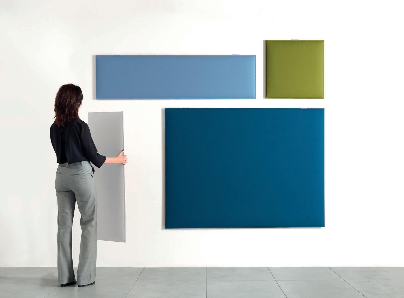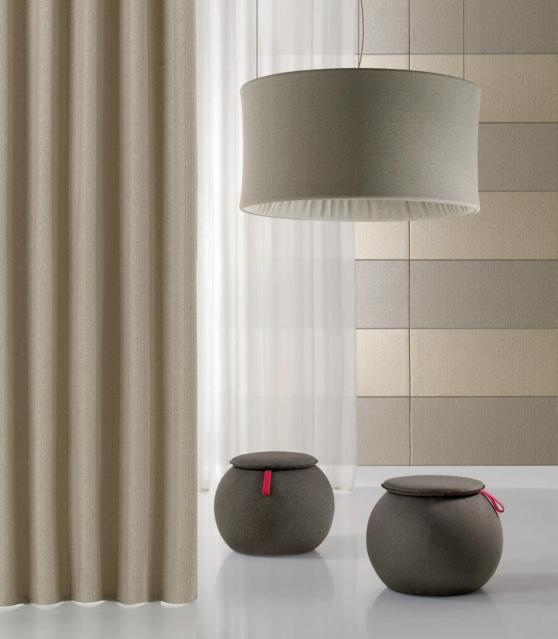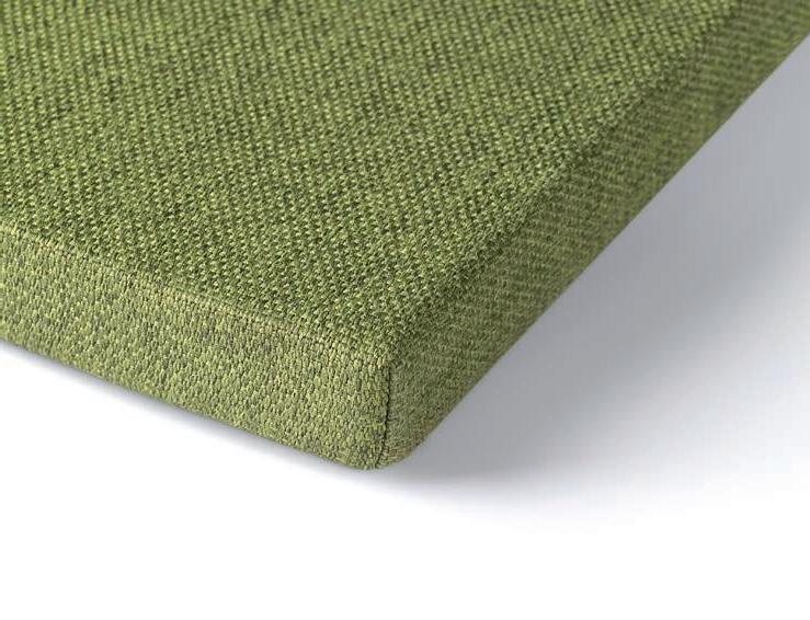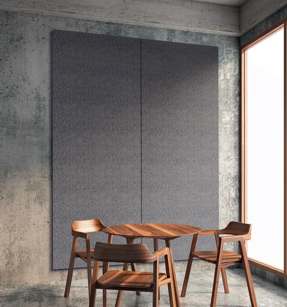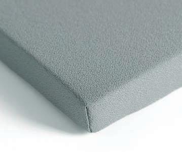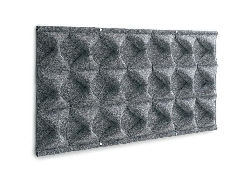 I Le superfici del pannello sono rivestite in tessuto di poliestere Trevira CS® solidamente applicato all’imbottitura interna con la quale forma un corpo unico senza soluzione di continuità. Proprietà che permette di ottenere una superficie che, pur essendo visivamente molto soft, risulta essere resistente, difficile da strappare e da perforare.