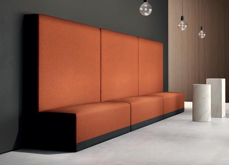 EN_Modular collection of sound-absorbing furniture distinguished by visually squared lines but with great softness to the touch. A band of anthracite-coloured fabric in the lower part creates a sill and an interesting chromatic play that accompanies all the elements. The optimal use of the Snowsound Fiber sound-absorbing cover achieves excellent acoustic performance.