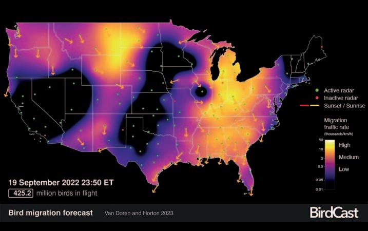 radar data allows us to “see” waves of migration as the birds sweep over the land. You can track migrations at BirdCast.info— a project of the Cornell Lab, Colorado State University, and the University of Massachusetts Amherst.