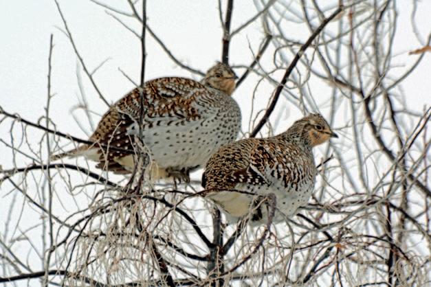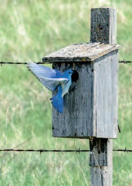 Above: Sharp-tailed grouse roost in a Russian olive tree, a common shelterbelt plant. Over the past century, landowners have planted thousands of shelterbelts that provide essential winter habitat. A mountain bluebird nests in a cavity of a dead standing tree. Snags (dead trees) are now left in some logged areas to provide habitat for cavity-dependent birds and mammals.