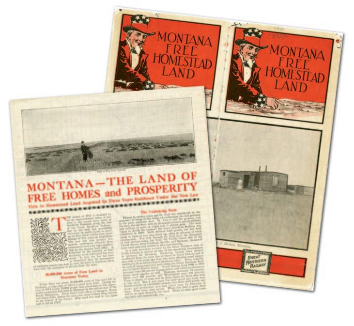 Encouraging the wide-eyed homesteaders were railroads that had recently laid lines across Montana. The Milwaukee Road, Northern Pacific, and Great Northern were eager for people to settle the emerging state. New residents would pay to travel, import goods and supplies, and grow grain to ship to eastern markets. The railroads widely distributed posters and brochures depicting Montana as an agricultural paradise. Federal and state agencies, local chambers of commerce, and other civic booster groups published ads and flyers promoting free land in “lush, fertile” Montana.