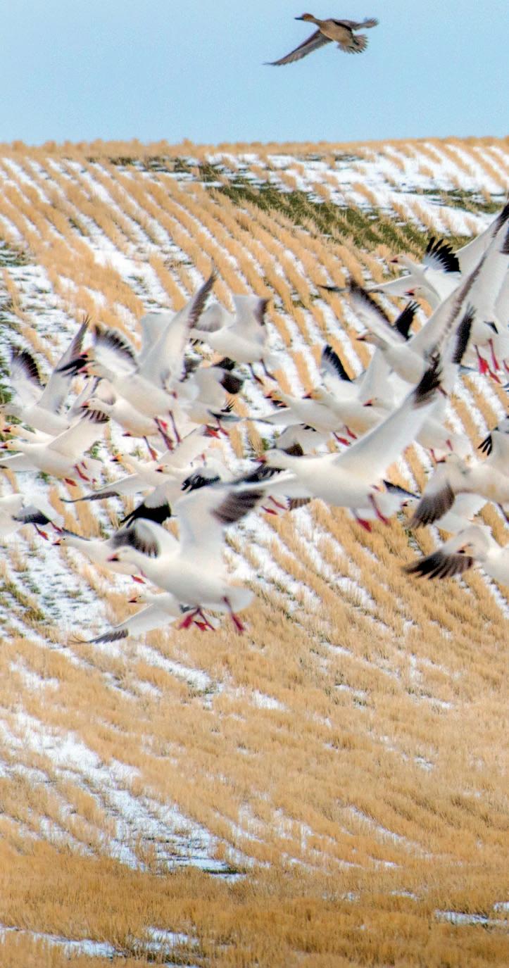 protection from winter storms. Floodirrigated fields in spring can provide a rich stew of aquatic insects for hungry ducks, cranes, shorebirds, and other migrants.