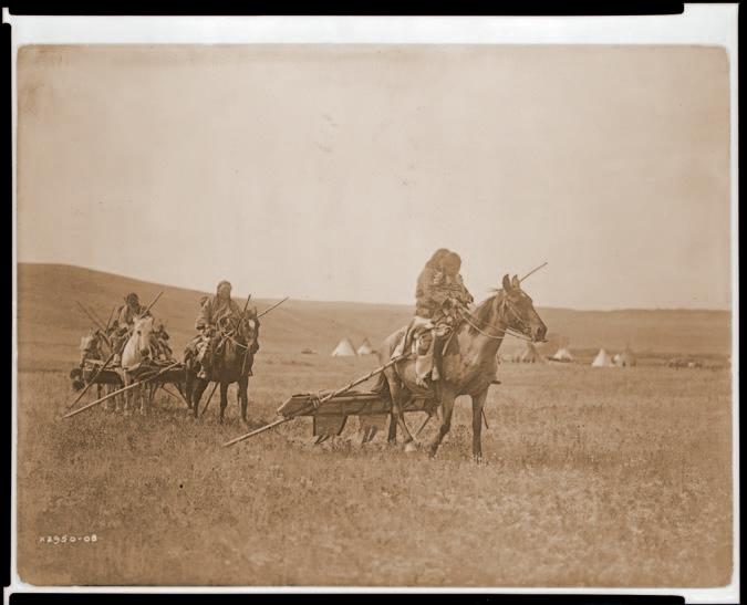 In this 1909 Edward S. Curtis photo, Indigenous men on horses drag travois past an encampment in eastern Montana. For thousands of years, people lived in this dry region, hunting bison and harvesting native vegetation adapted to the semi-arid landscape.