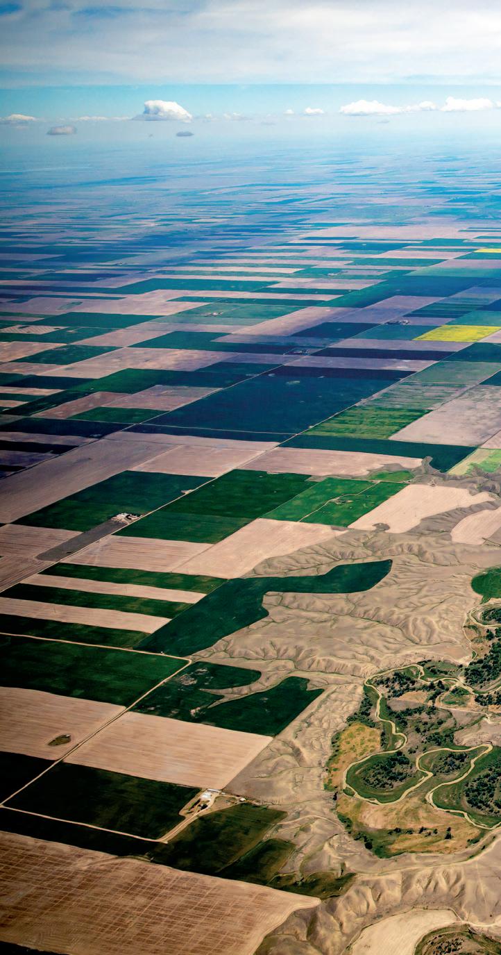 Above: The Teton River winds through Teton County across a patchwork of wheat, barley, alfalfa, canola, and other crop fields. Most of the acreage in north-central Montana is dryland (not irrigated), putting it at risk of low yields during drought conditions.