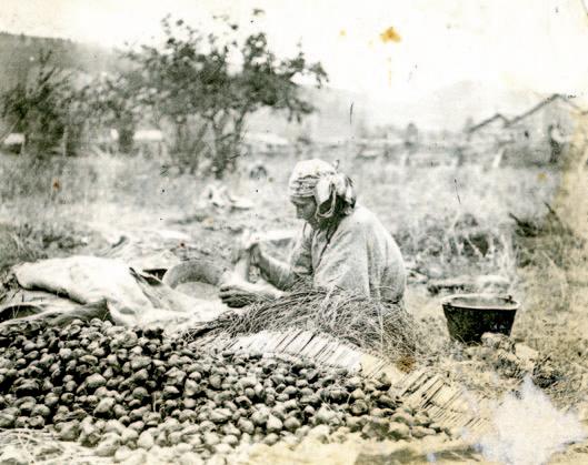 Left: Historic photo of a Nez Perce woman in what is now Idaho sorting and cleaning camas root similar to how the Salish of western Montana processed the plant for thousands of years.