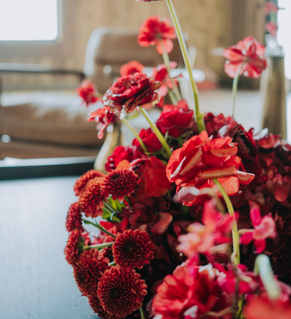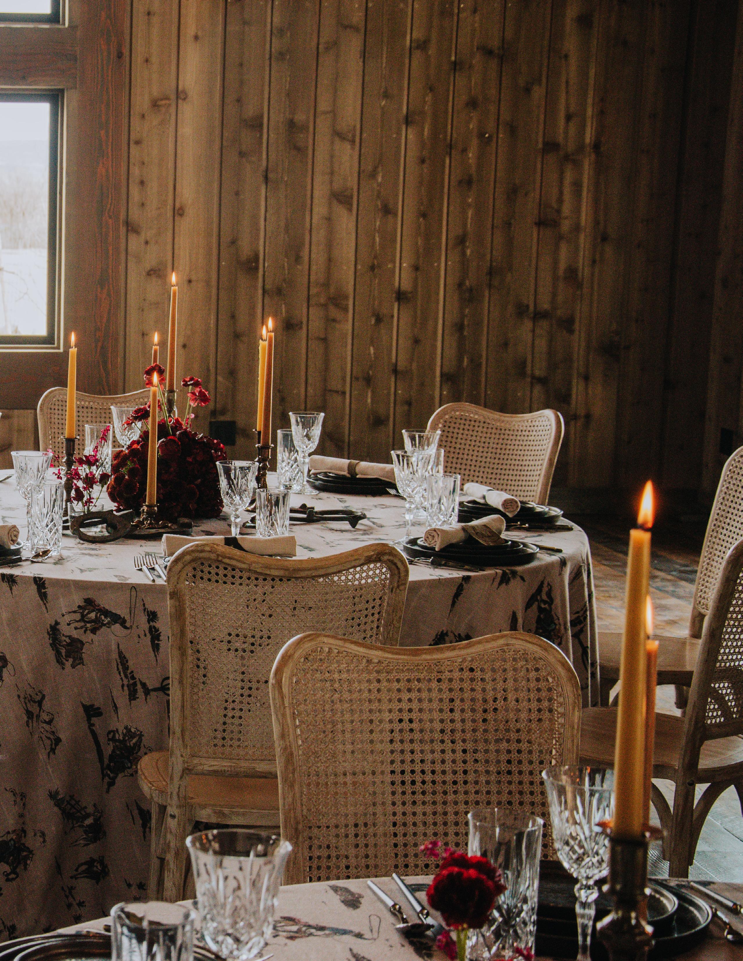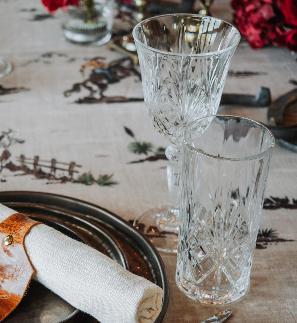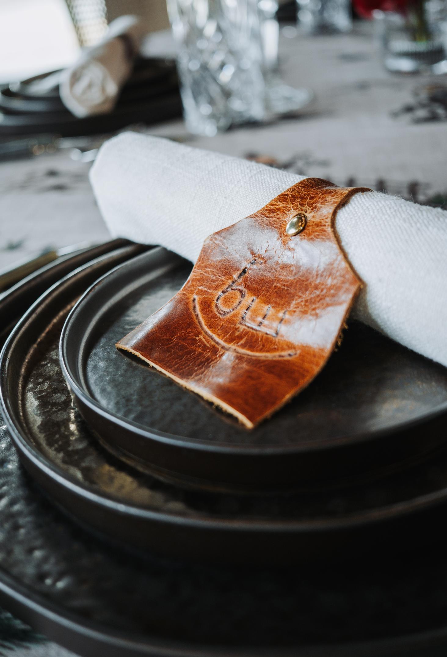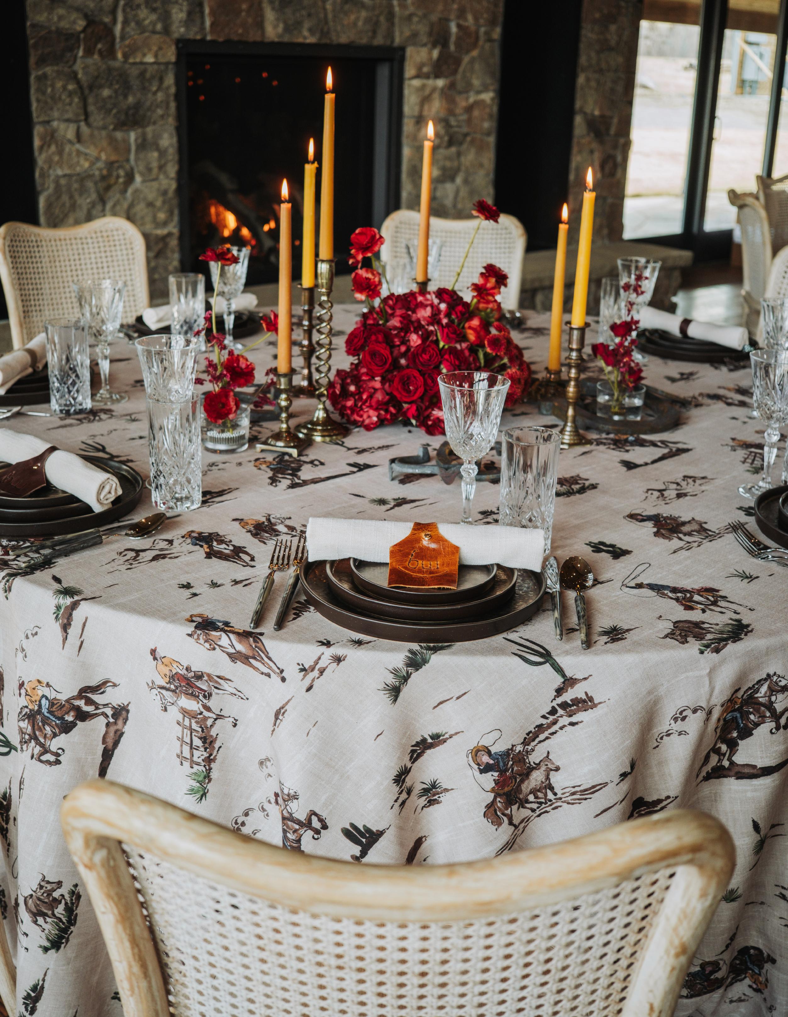 We paired this rustic western linen with our Maddox Plate and Crystal Glassware. Crimson florals add a rich and moody personality to the table, and the light napkins with custom engraved leather cattle tags ground the setting.