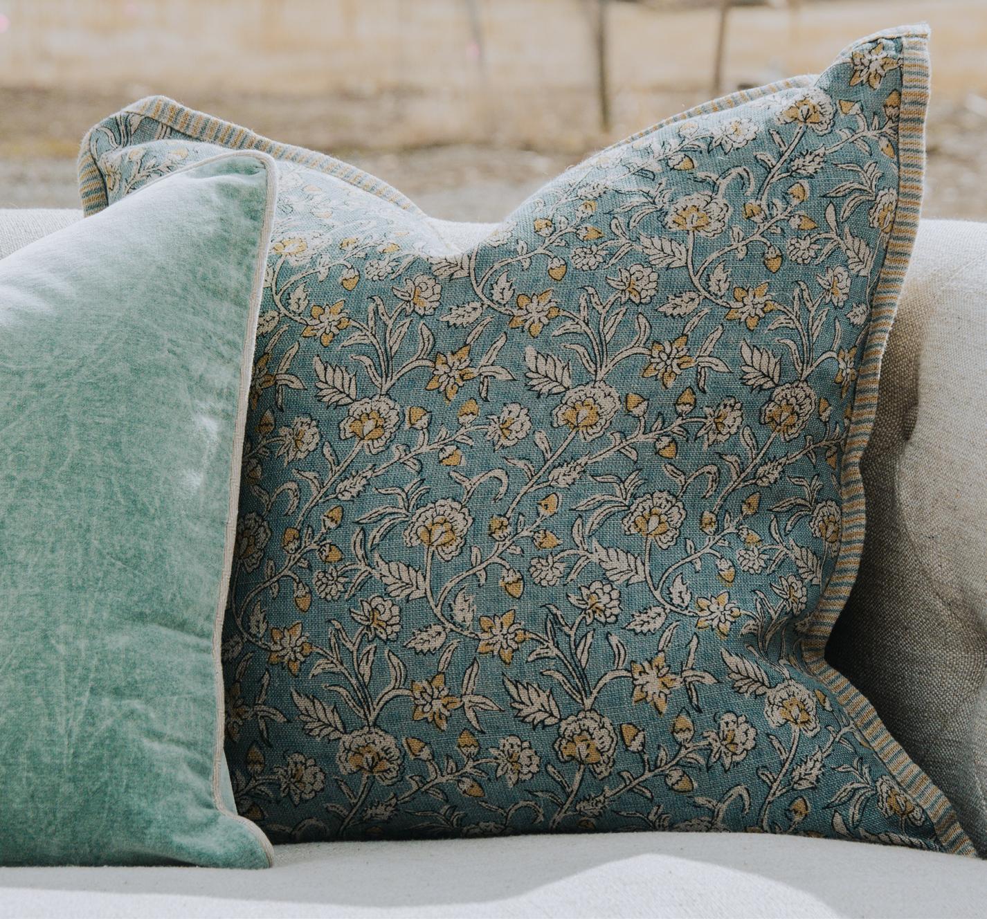 Warren Sofa with the Clark Coffee and Side tables, Hatfield Chairs, the Marie Rug, and the Sienna Velvet, Aquamarine Velvet, and Canary Dusty Blue accent pillows.