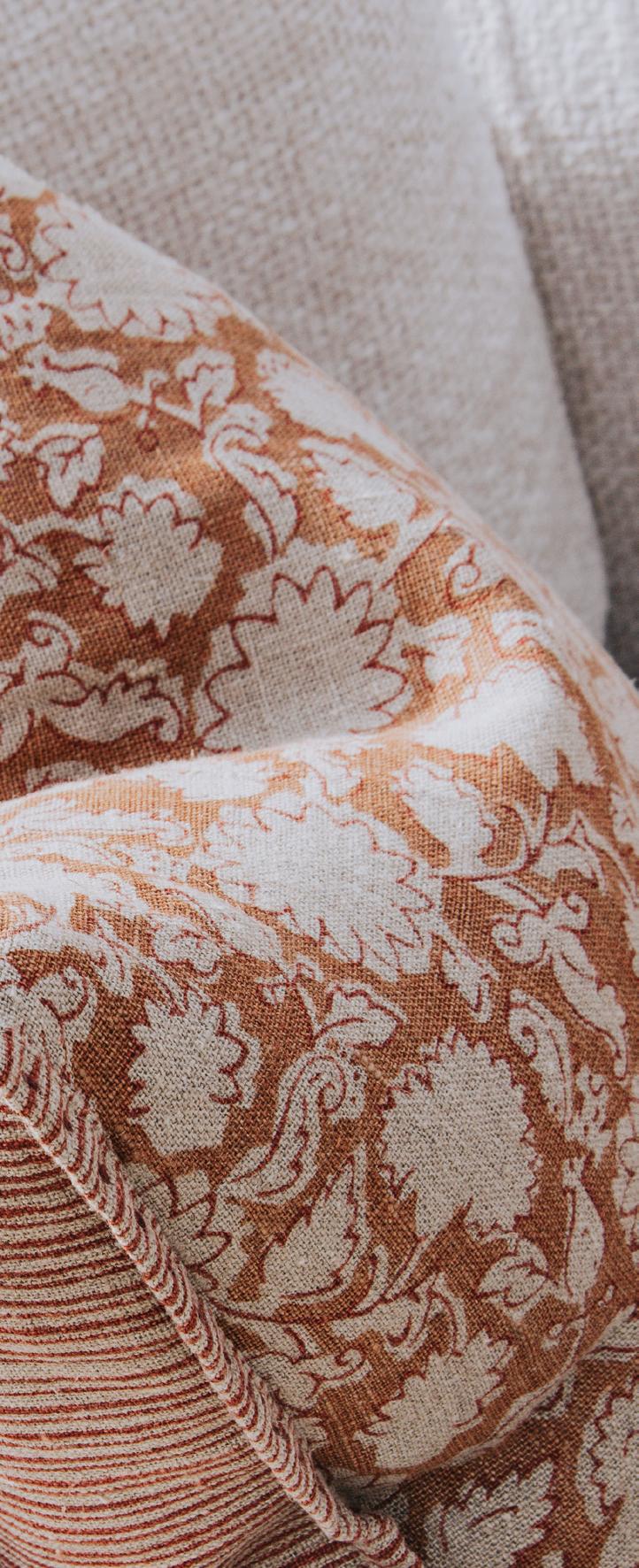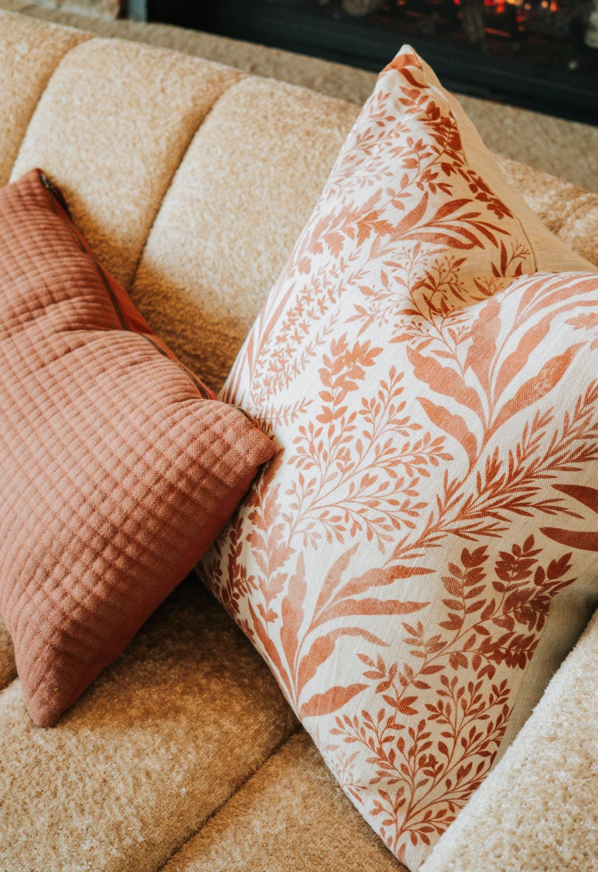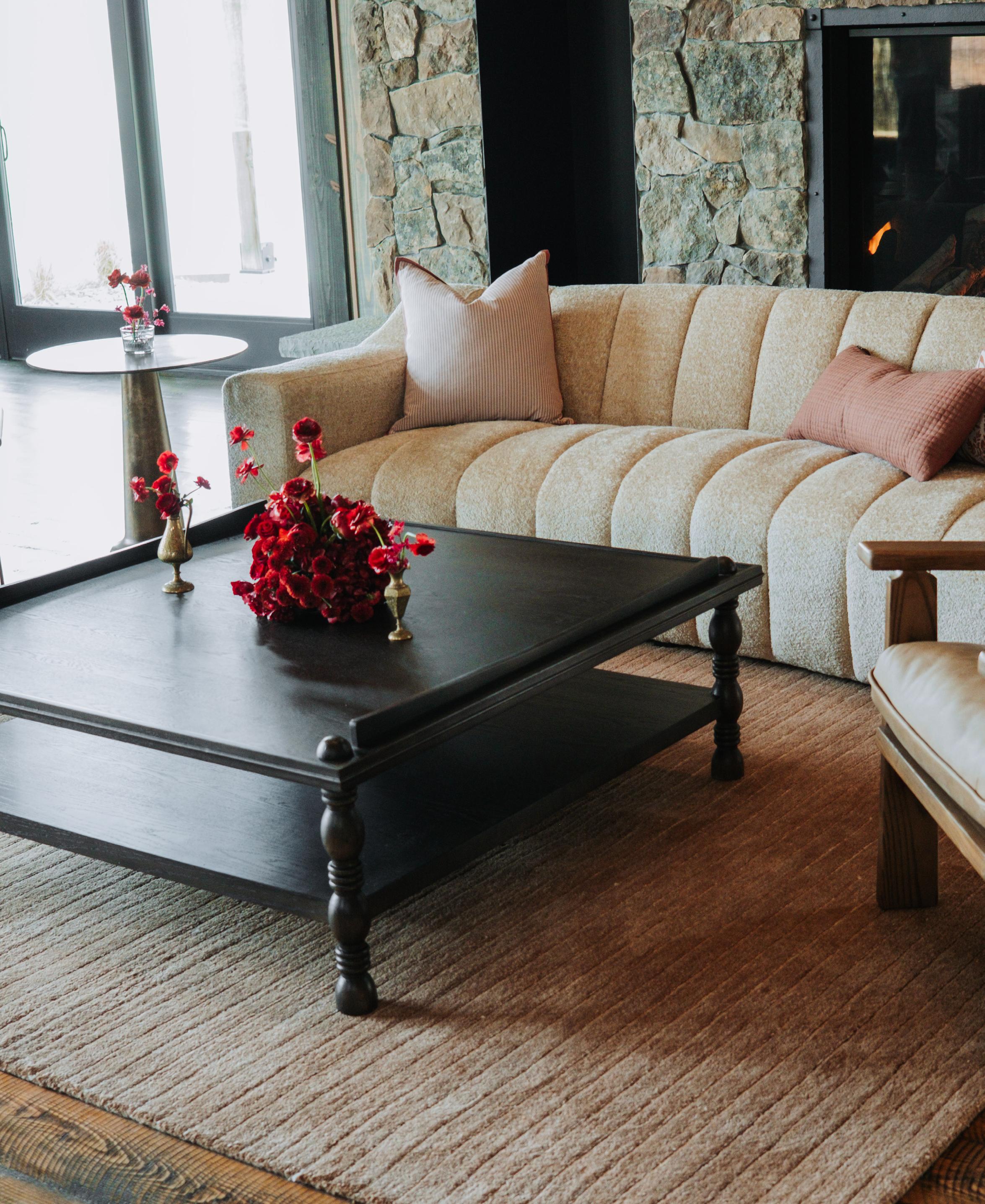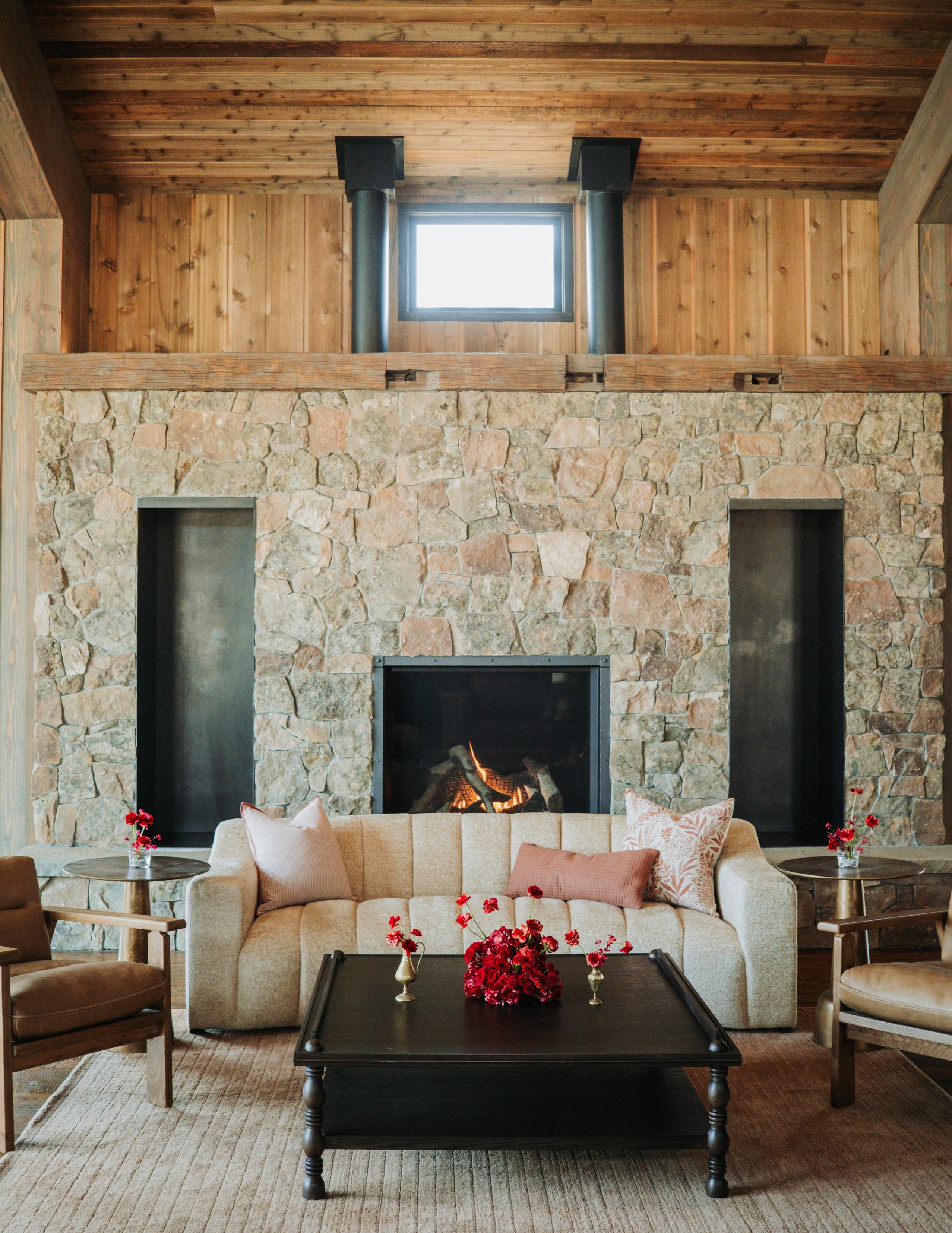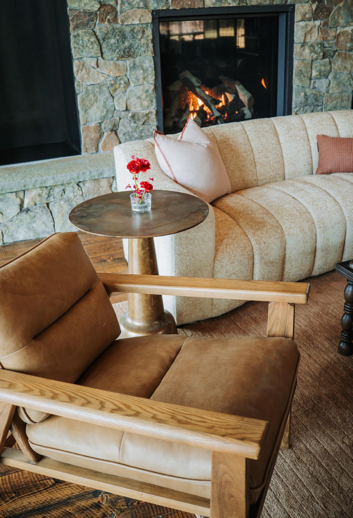 As the evening settles in, this inviting lounge becomes a natural gathering place, where the glow of the fire casts a warm, intimate light across layered wood and stone. The Frankie Sofa and Smith Chair frame the hearth, creating a setting that feels both relaxed and quietly refined. Rich textures and deep, earthy tones are softened by thoughtful details—deep red florals, warm accent pillows, and the gentle flicker of flame. It’s a space designed for lingering: an after-hours retreat where conversation flows easily and dessert by the fire feels like a home.