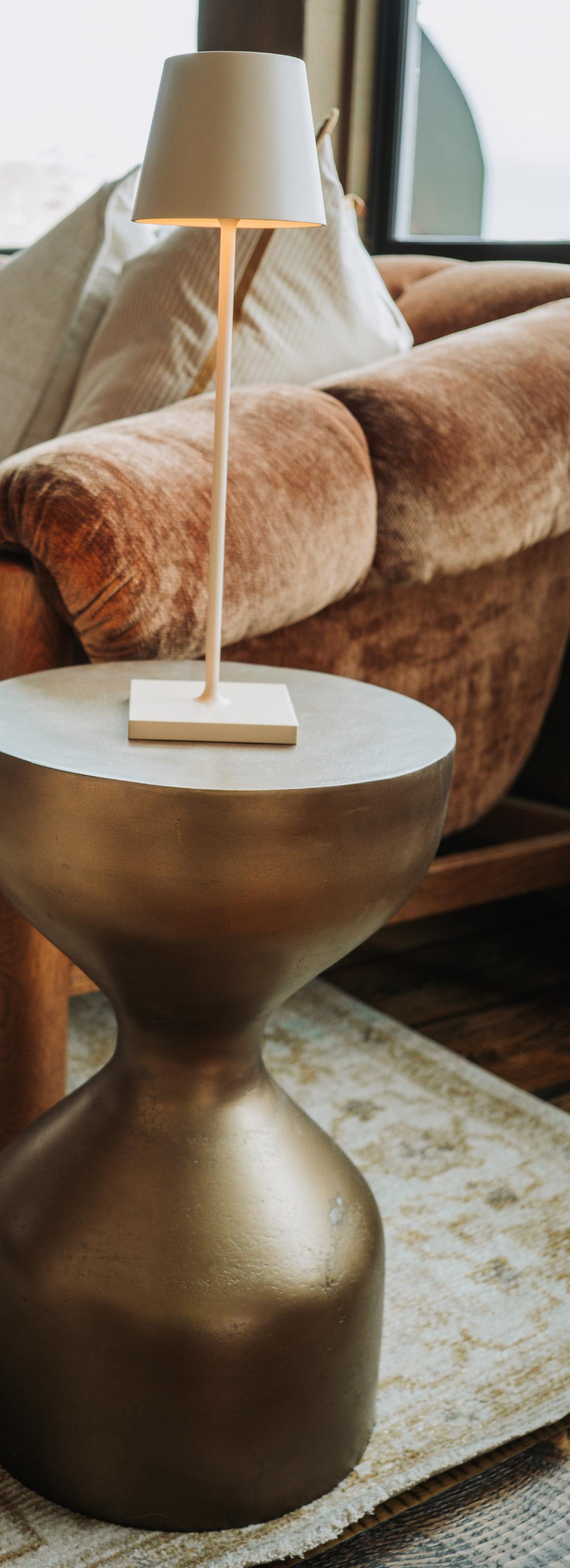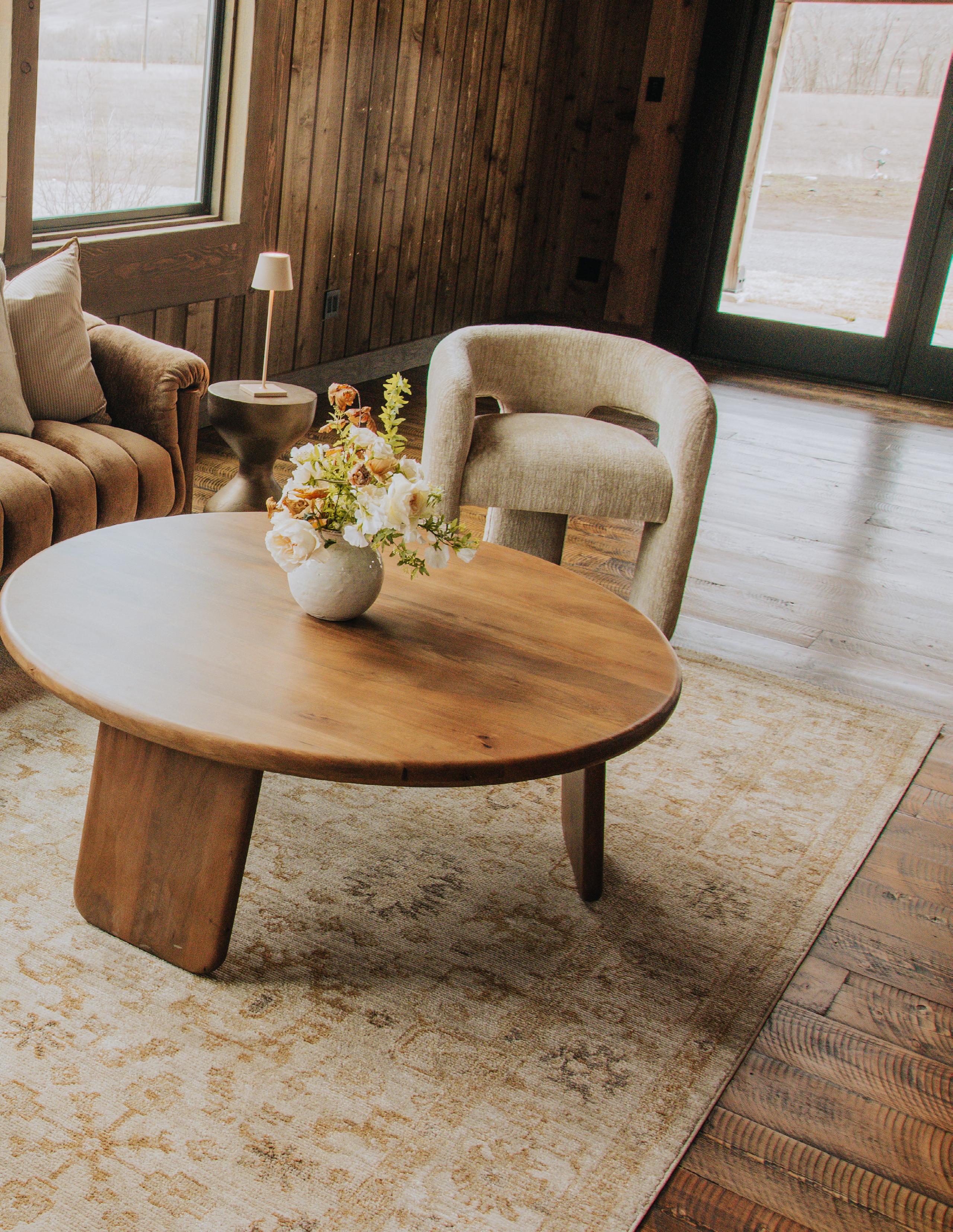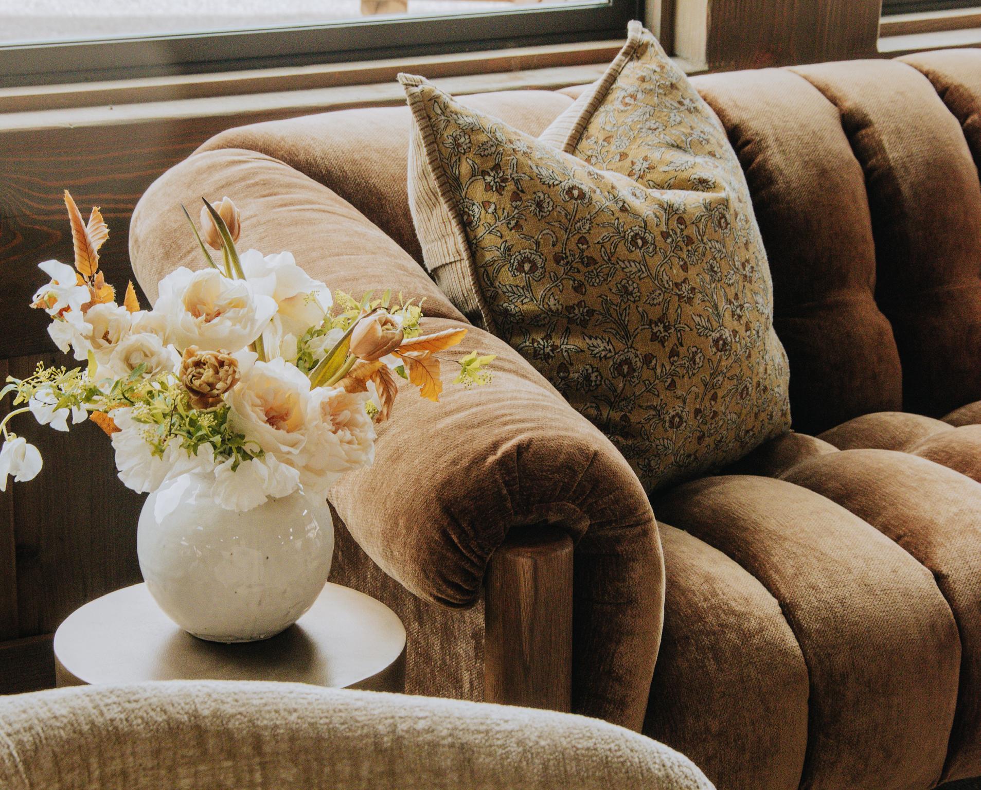 Bathed in soft natural light, this lounge strikes a perfect balance between warmth and comfort. The sculptural elements of the Lloyd Coffee Table anchors the space, surrounded by plush, curved seating in earthy and inviting tones. The new Arlo Sofa and Monet Chair pair together with layered textures of velvet and linen. Thoughtfully placed neutral toned florals echo the natural landscape just beyond the windows. The Poldina Lamp in sand creates a soft glow that welcomes you to the space, seated on our new Miguel Side Table. The result is an intimate, design-forward lounge that feels both elevated and effortlessly livable. Perfect for downtime at a corporate retreat or private event.