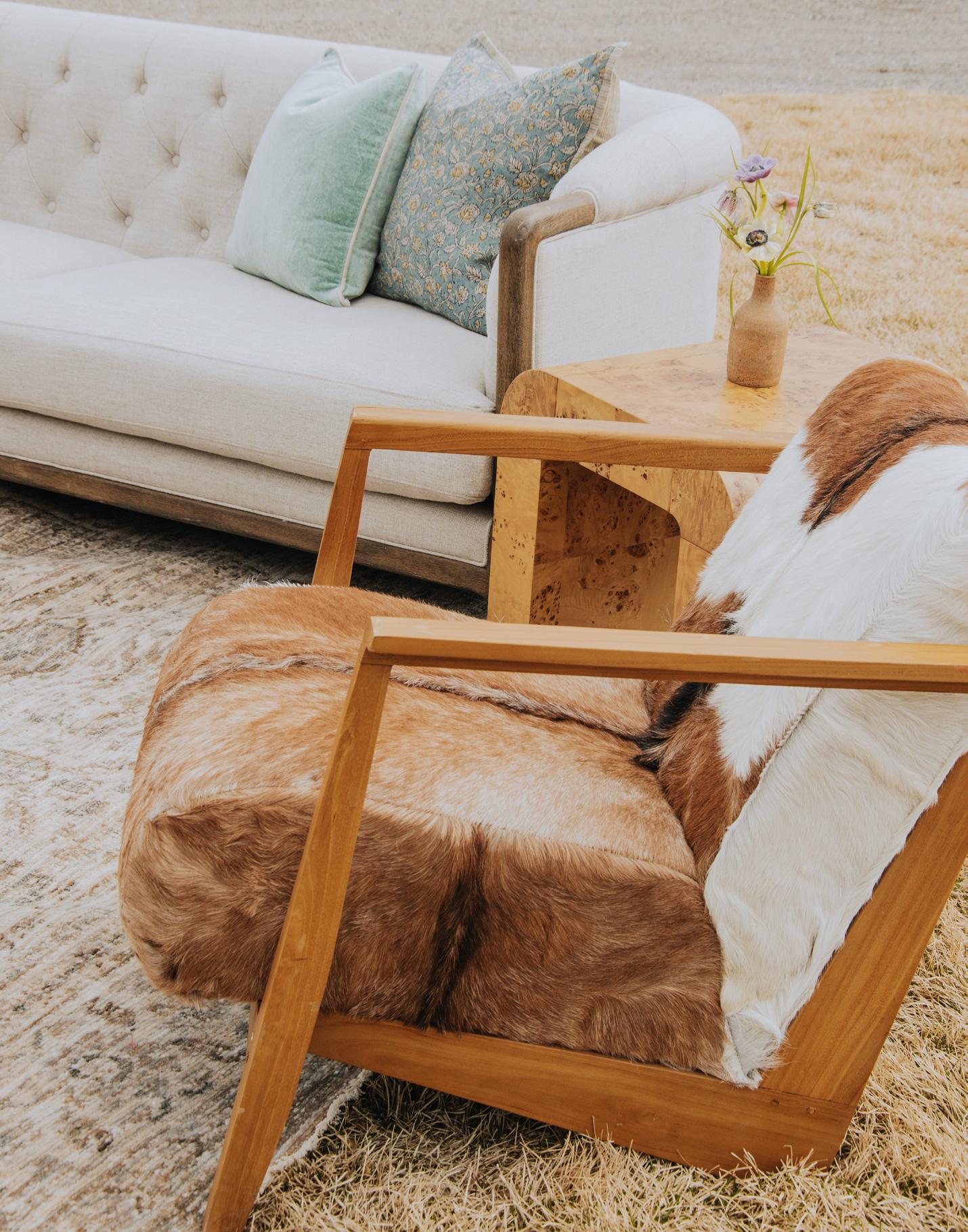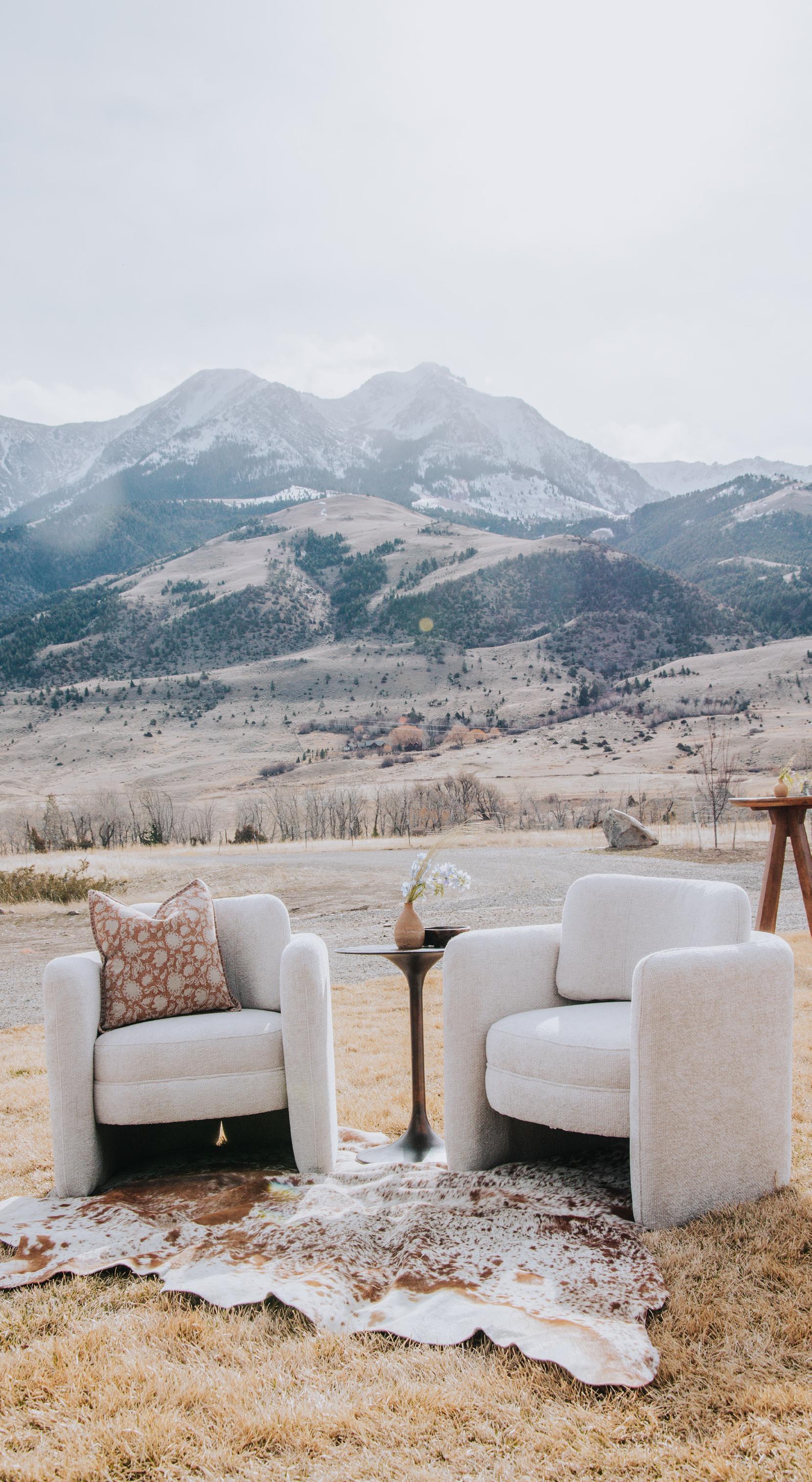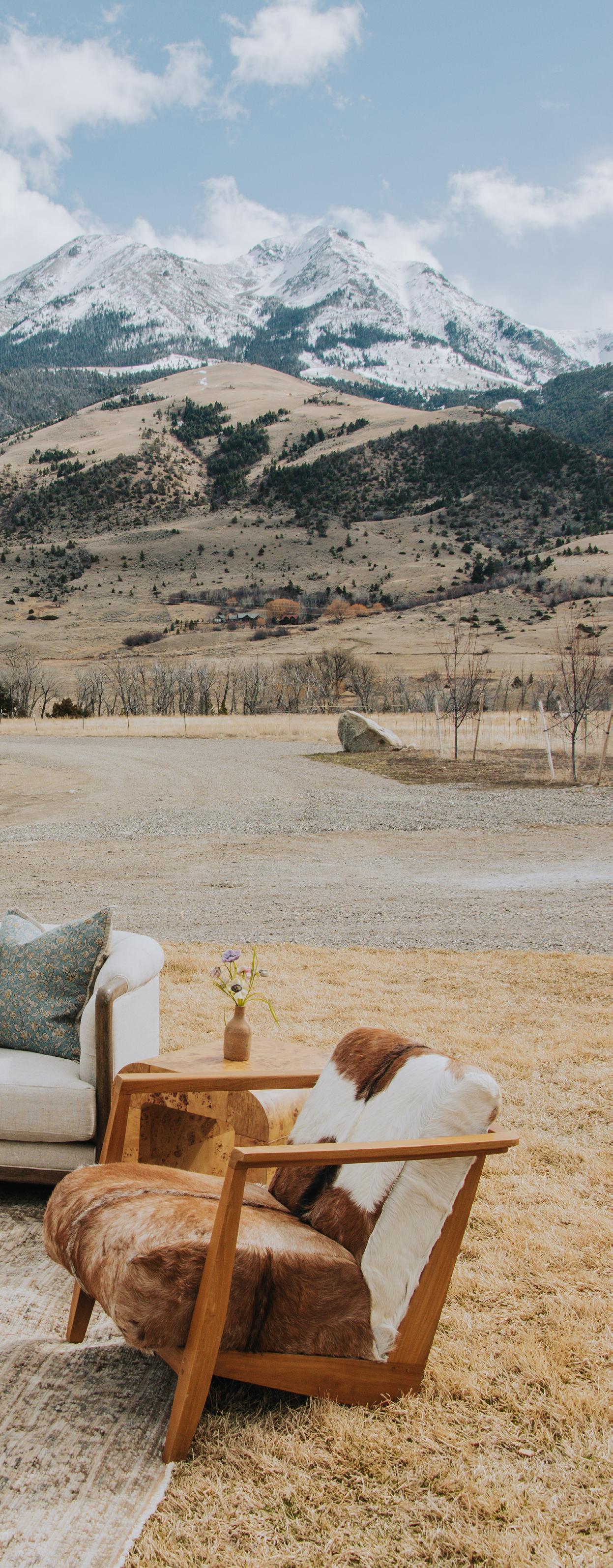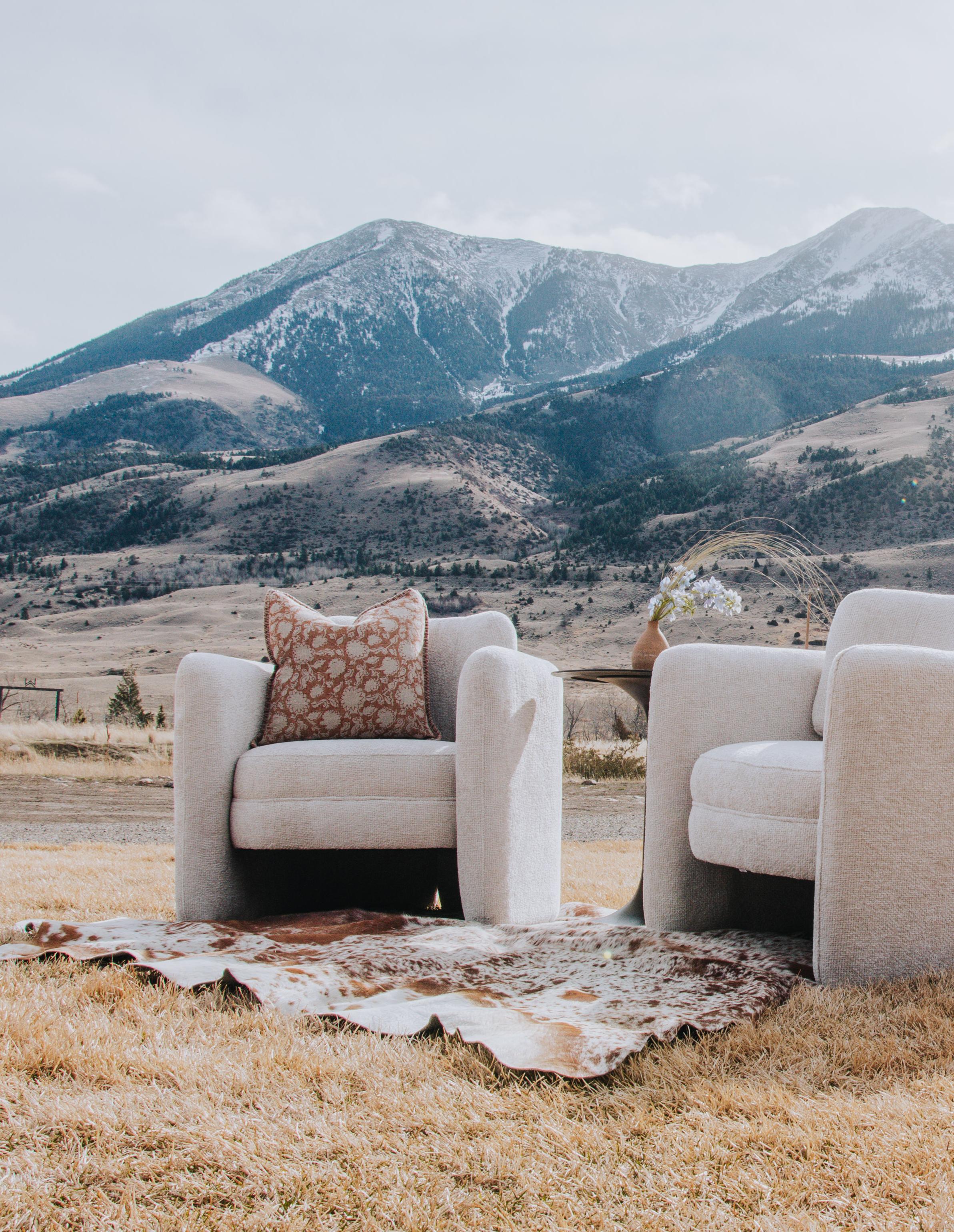 SEATING WITH A VIEW! GIGI CHAIRS PAIRED WITH THE TULIP SIDE TABLE, THE COLLINS PILLOW, AND THE BROWN AND WHITE COWHIDE MAKES A STATEMENT COMPLIMENTING THE BLUE TONES OF THE MOUNTAIN LANDSCAPE AND FLORALS.