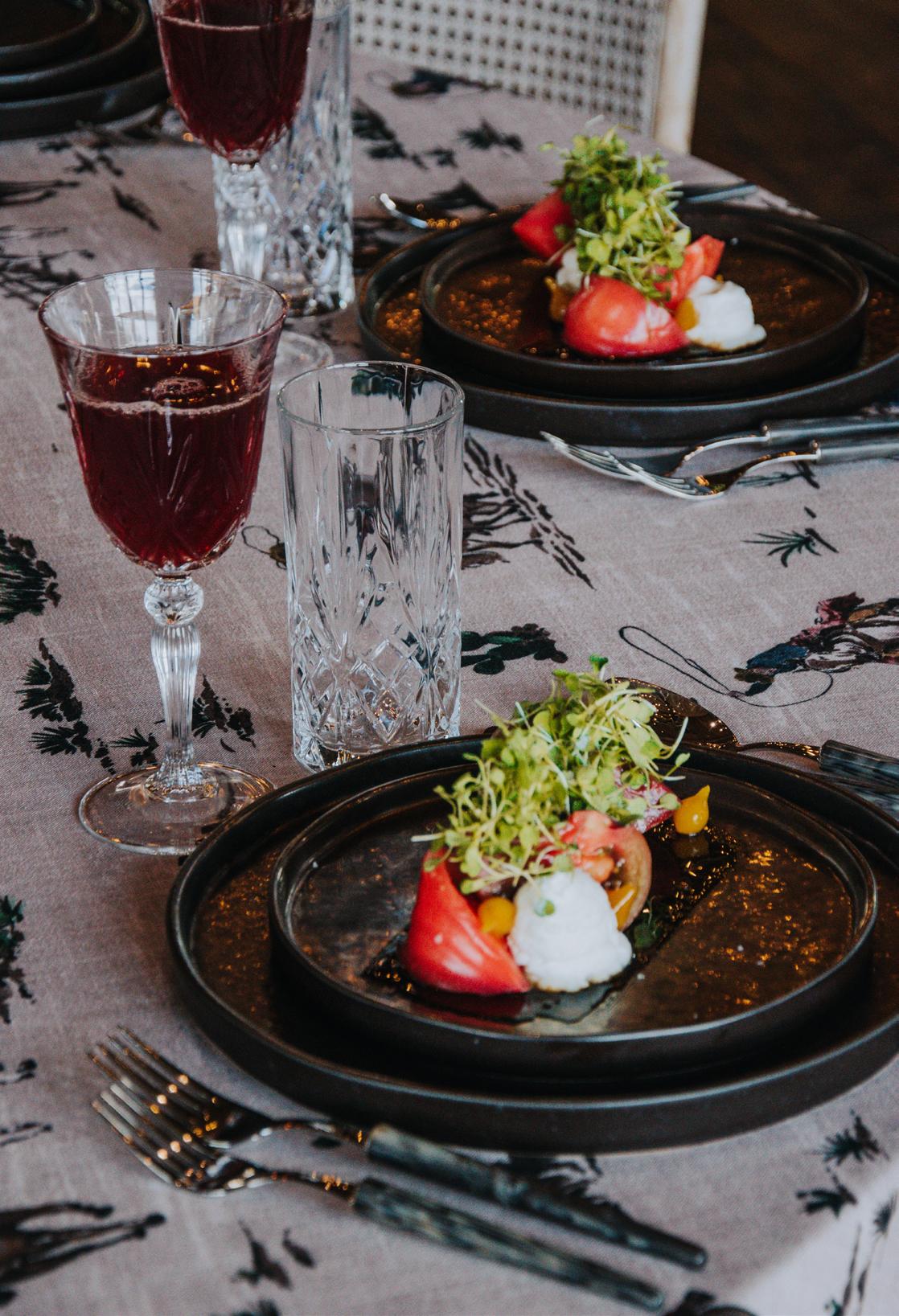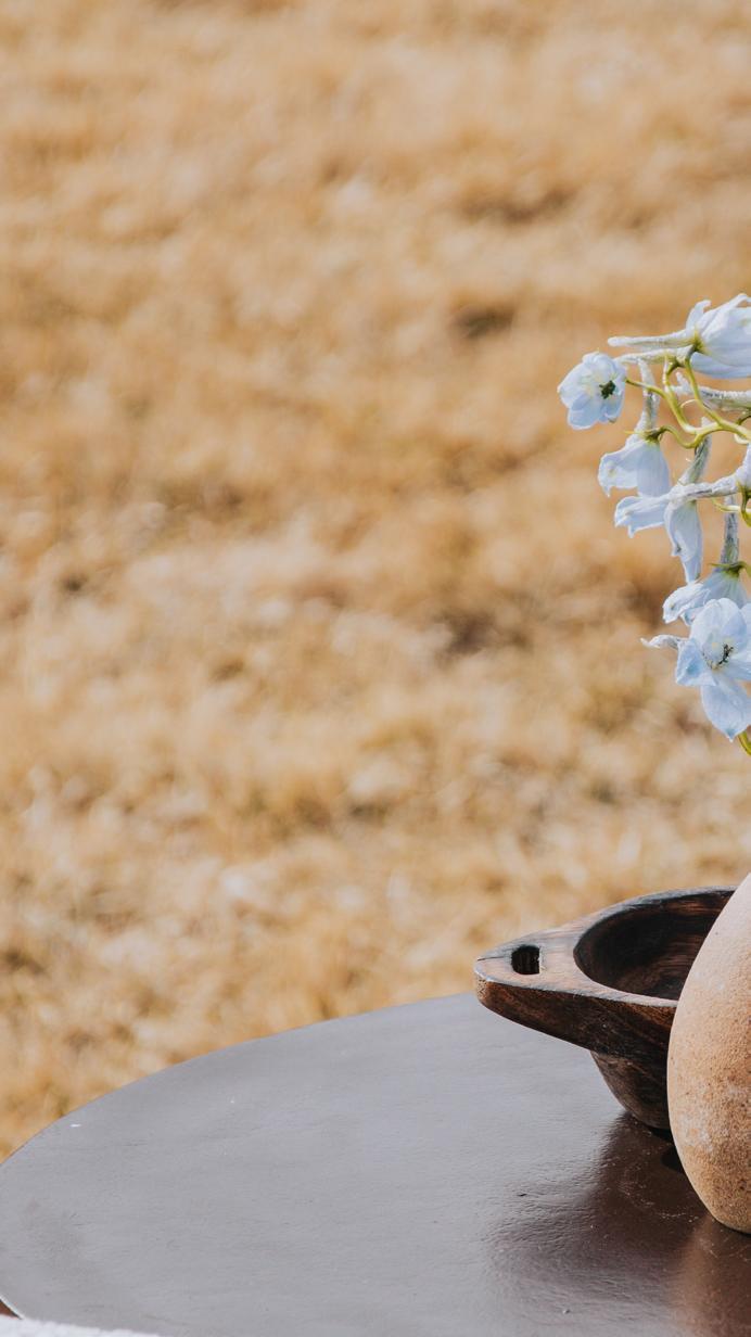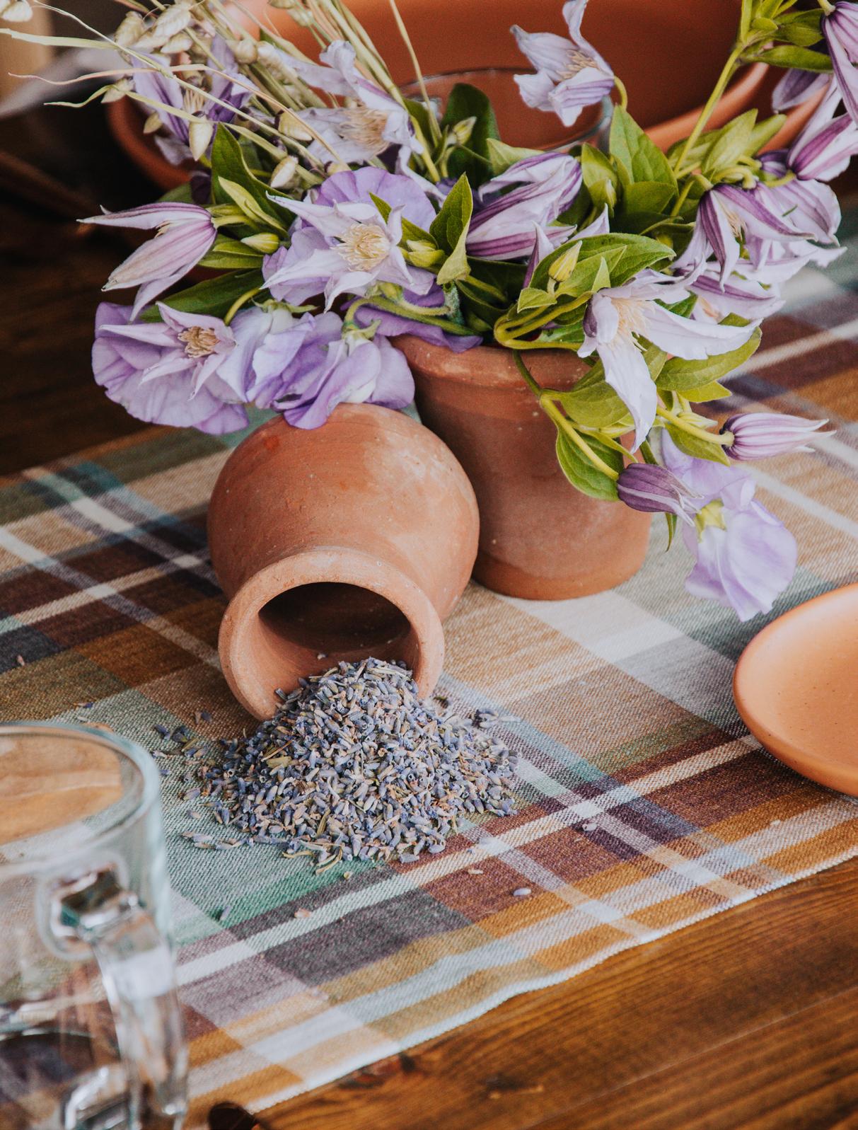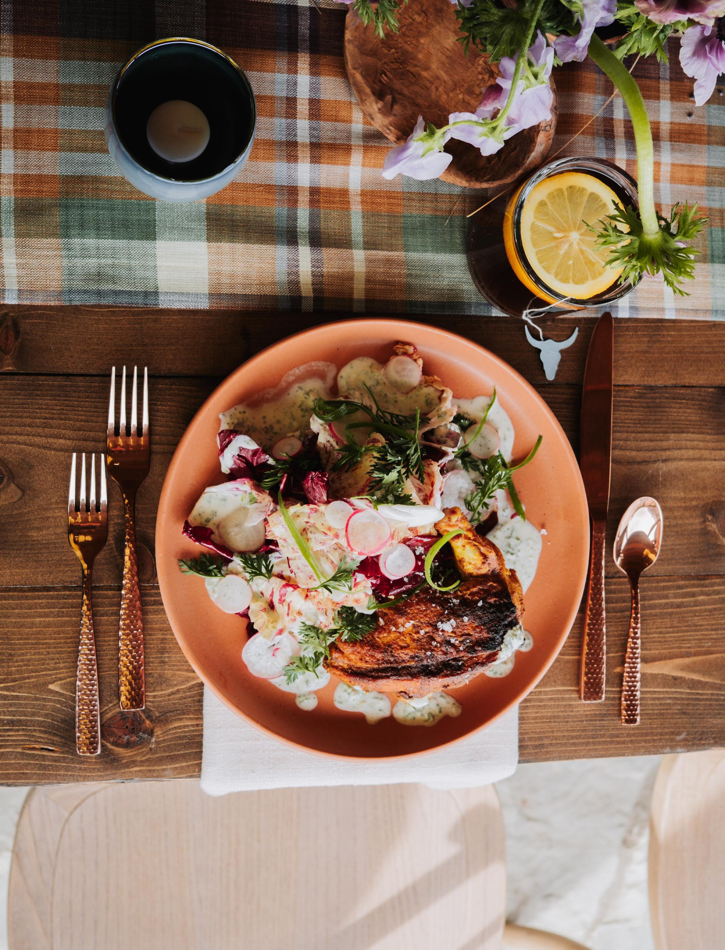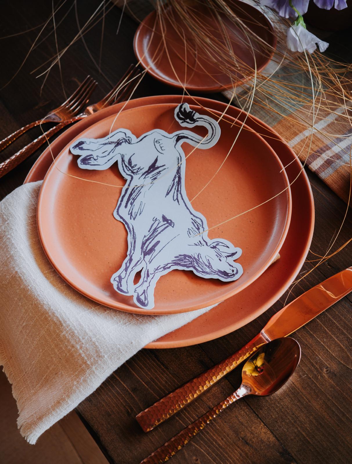 On this tablescape, custom menus featuring a die cut steer, and tea tag place cards remind you that details matter. Steaming tea pairs with Grilled Chicken, Radicchio Salad, and House Ranch thoughtfully prepared by the team at Sage Lodge. Copper Flatware compliments the tones of the plate creating a monochromatic look. Dried lavender and grass adds dimension to the tabletop.