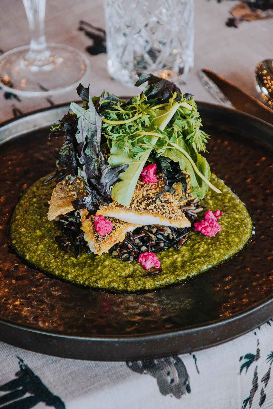 CRUSTED TROUT WITH WILD RICE ON A BED OF HERB PESTO