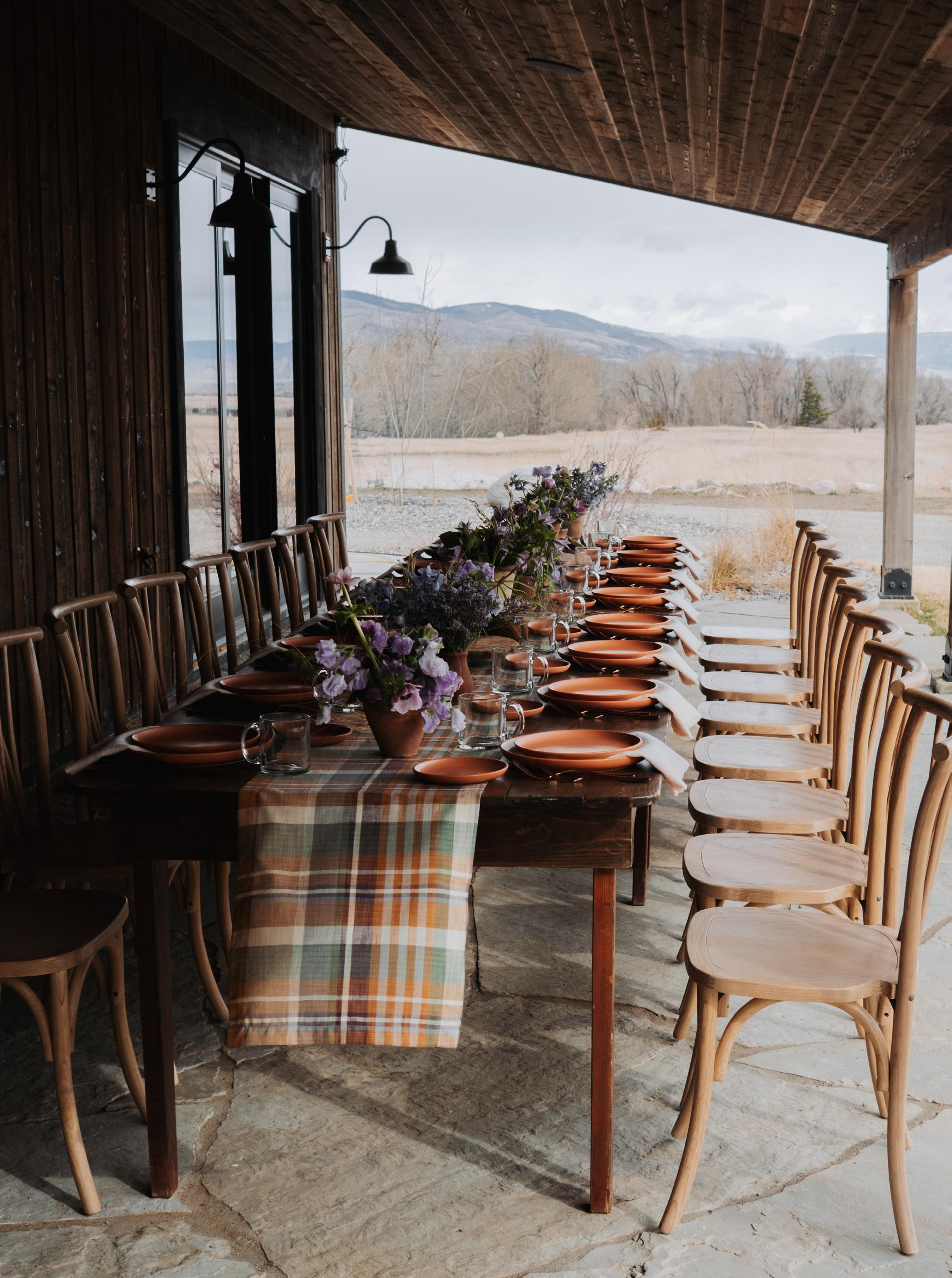 CHARLOTTE CHAIRS LINE A FARM TABLE STYLED WITH SPRING FLORALS THAT COMPLIMENT THE PURPLE AND GREEN TONES OF THE TABLE RUNNER. A VIEW OF THE ABSAROKA RANGE GIVES A GROUNDING EFFECT TO THIS TABLESCAPE: THE PERFECT PLACE TO SIT AND ENJOY A MEAL SURROUNDED BY COMMUNITY.