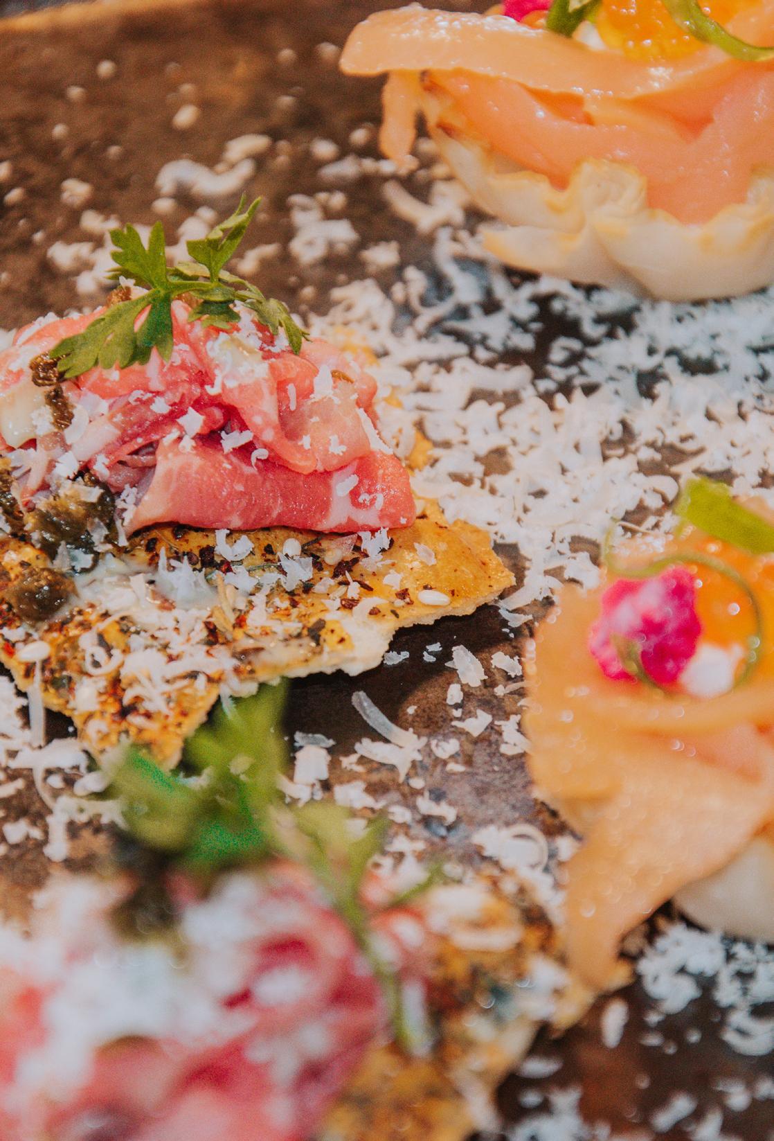 SMOKED SALMON IN A PHYLLO CUP AND BISON CARPACCIO