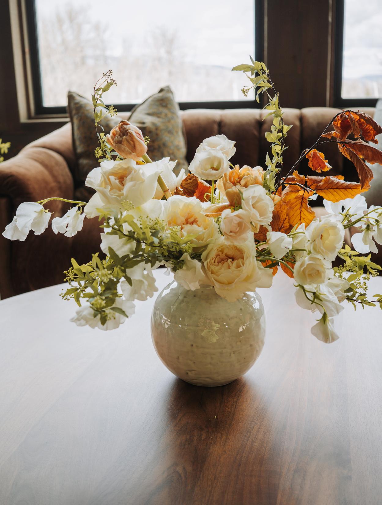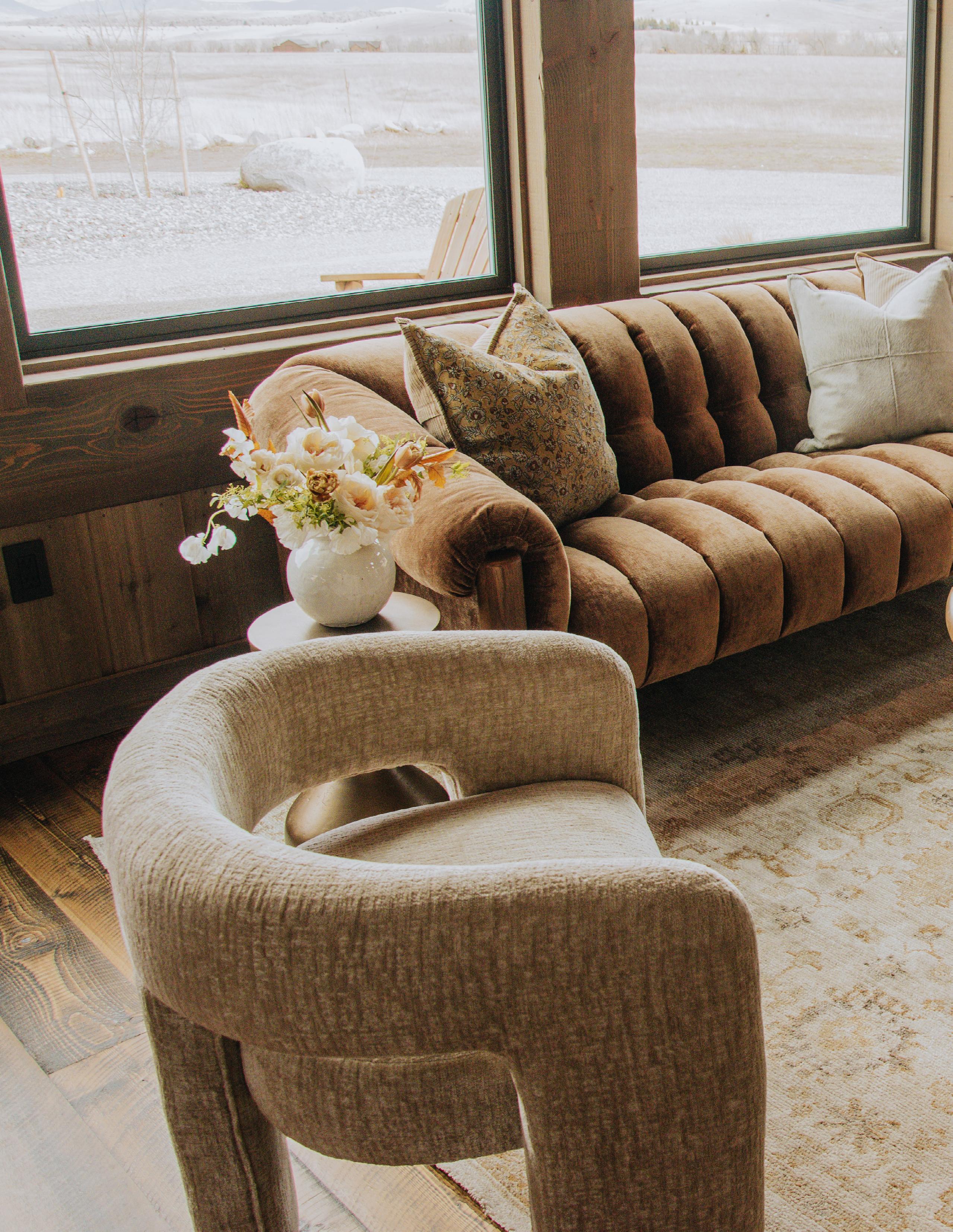 The natural brown tones of the woodgrain and cowhide pairs beautifully with the cool teals of the mountains, florals, and accent pillows to create a timeless Montana lounge. We paired the