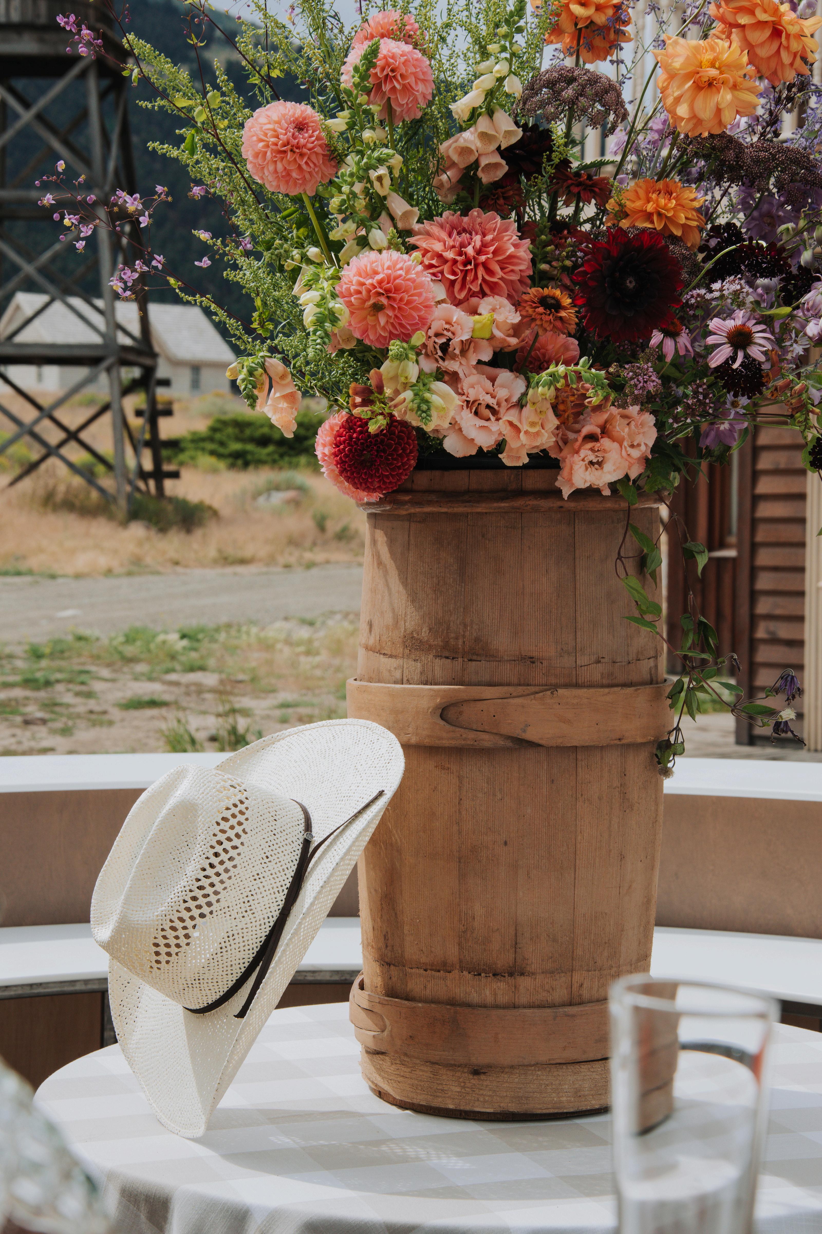 THE PATINA OF AN OLD CHURN PAIRS BEAUTIFULLY WITH THE CLEAN LINES OF THE ROUND BAR AND MAKES A LOVELY VESSEL FOR THE FLORALS