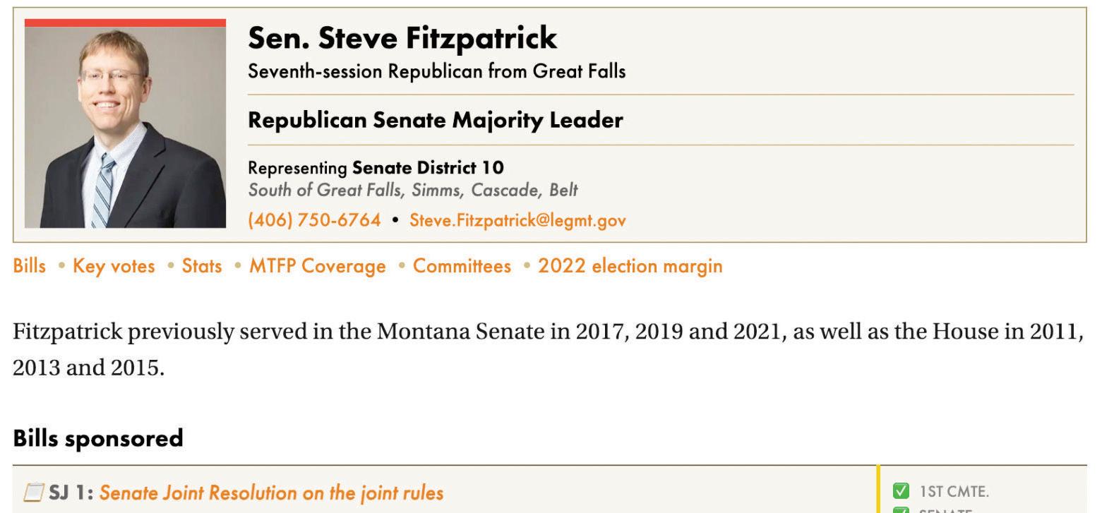 A portion of the MTFP 2023 Capitol Tracker bill page for Sen. Steve Fitzpatrick, R-Great Falls.