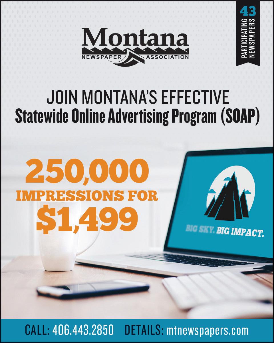 dark get don’ t left in the read public notices www.MontanaPublicNotices.com STATEWIDE ADVERTISING 2X2 $406 | 2x3 $650 | 2X4 $1,100 | 2X5 $1,500 REACH THE 406 FOR $406 2 X 2 ad measures 3.7” horizontal by 2” vertical Montana’s statewide advertising network REACH 400, 000+ readers each week 60 Newspapers 1 low cost