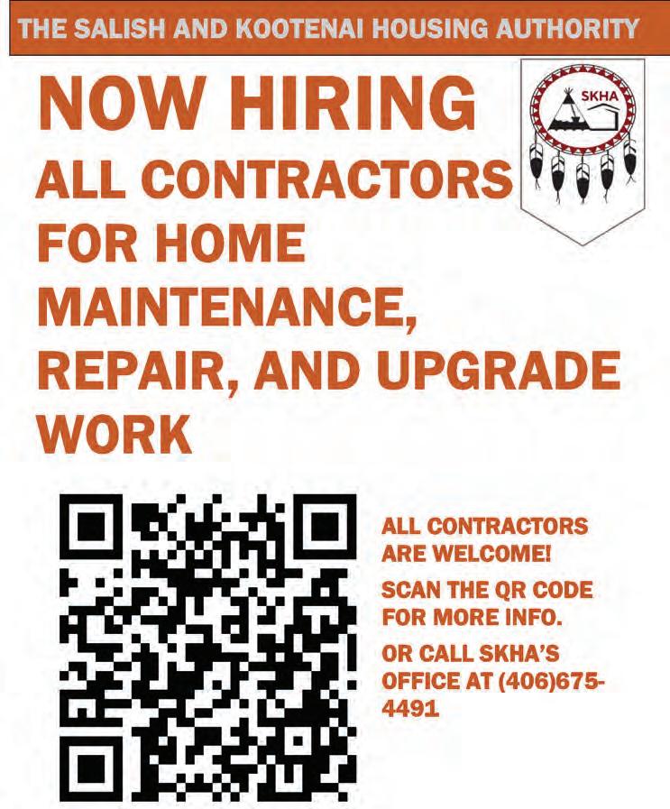 manager including experience managing grants or contracts. Must possess a valid driver’s license. All applicants must submit a Tribal application, a copy of academic transcript, certifications, proof of state licensure, copy of valid driver’s license, if claiming Tribal preference, proof of enrollment from a federally recognized Tribe if other than CSKT, and if claiming veteran’s preference, a copy of the DD214 must be submitted. FAILURE TO SUBMIT ALL OF THE ABOVE INFORMATION WILL RESULT IN IMME- DIATE DISQUALIFICATION DURING THE SCREENING PROCESS. This position is a Testing Designated Position (TDP) within the definition of the CSKT Drug Testing policy. The successful applicant, if not already employed by the Tribes must pass a pre-hire drug test and serve a mandatory six (6) month probationary period. Salary is $16.86$19.38 per hour, plus benefits.