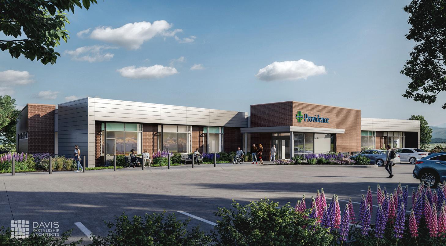 Turning over the ceremonial first shovelfuls of dirt at the July 14 groundbreaking are: Steph Goble, Chief Philanthropy Officer, Providence Montana Health Foundation; Scott O’Brien, Chief Executive, Providence Eastern Washington and Montana; Bill Calhoun, Chief Executive, Providence Montana Service Area; Laurie Kelly, Senior Vice President, Chief Philanthropy Officer, Providence; Caryl Perdaems, Chief Administrative Officer, Providence St. Joseph Medical Center; Eric Sprunk, Honorary Co-Chair, Critical Access Campaign; Blair Sprunk, Co-Chair, Critical Access Campaign; Kelly Bagnell, OB-GYN, Chief of Staff, Providence St. Joseph Medical Center; Howie Long, Honorary Co-Chair, Critical Access Campaign; Diane Long, Co-Chair, Critical Access Campaign; Ali Santore, Chief Communications and External Affairs Officer, Providence; Erik Wexler, President and CEO, Providence; Megan Beard, Senior Philanthropy Officer, Providence Montana Health Foundation. Below: Pictured below is an architectural rendering of what the new rural clinic will look like when completed.