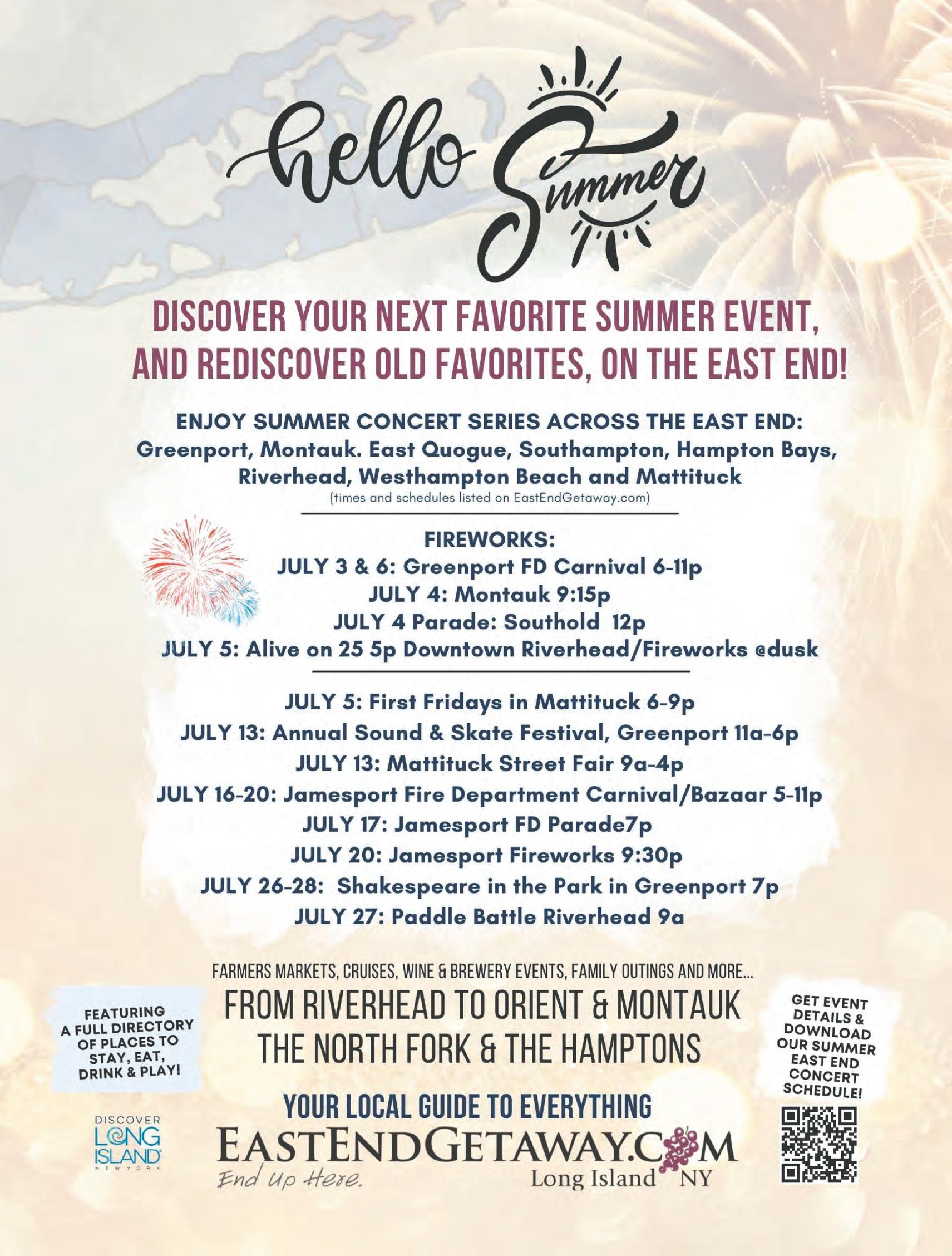 13-14Second House Craft Fair. 10am-6pm Saturdy; 9am-5pm Sunday. On the beautiful grounds of the Second House and Montauk Indian Museums. Enjoy live acoustic music and grab a snack as you browse the booths at our annual showcase of high-quality, hand-crafted goods. www.montaukhistoricalsociety.org/event/july-second-house-fair/ 14Gosman's Dock Concert - Hoodoo Loungers. FREE. 6-8pm on Gosman’s Outdoor Stage at 484 West Lake Drive.