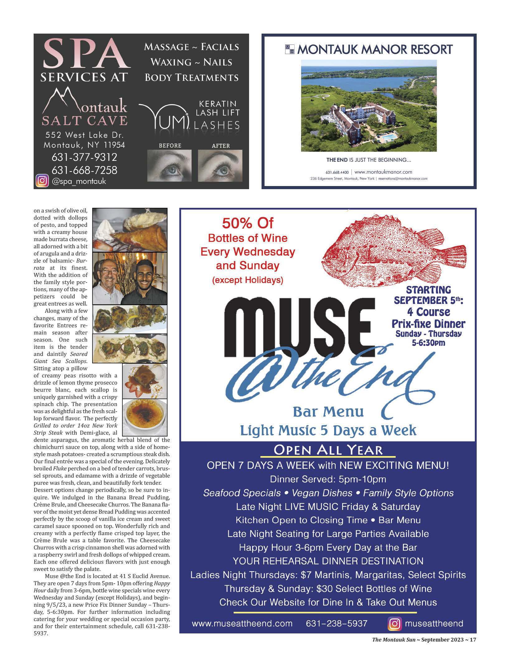 Naturally when in Montauk visitors’ number one meal choice is usually from the sea. At Surfside Inn & Restaurant, all ingredients are locally sourced for ab‐solute freshness for their menu items including the produce and coastal cuisine. Devon returned to inform us of the specials that evening that we might like. The grilled cod nesting on a bed of sauteed spinach with a light curry sauce and sliced oranges caught my eye, while my husband picked the Savanna Style shrimp with Andouille sausage sauteed with red and green and onions over cheddar cheese grits. After Mary or‐dered the sesame pan seared Saku Block Ahi tuna served with field greens, drizzled with Balsamic glaze, seaweed salad and pickled ginger and wasabi, Devon said the Chef’s suggestion “for maximum enjoyment was to have the tuna rare or medium rare.” So medium rare it was. Now three orders were from the sea, Joel couldn’t resist the ribeye steak, mashed potatoes and grilled asparagus, knowing he would be sampling his wife’s ahi tuna, too. Honestly, finding which entrée to select was no easy task considering all the tempting menu items! Under “From the Farm” was an 8 oz Prime Filet Mignon, Barbecue glazed Pork Shank, Mango Chipotle BBQ baby back ribs, Chicken Paillard and roasted Long Island duck topped with orange Grand Marnier Sauce, wild rice and seasonal vege‐tables. Then there is Pasta, Pasta, Pasta a select menu of mouthwatering dishes Sous Chef Fernando Mireles has developed along with the appetizers that will tempt any palate. There is Lobster Ravioli, Sautéed Shrimp Capellini, Linguine with white or Red Clam Sauce or Homemade Beef Bolognese Sauce. Surfside has an array of menu selections to satisfy every guest in your party.