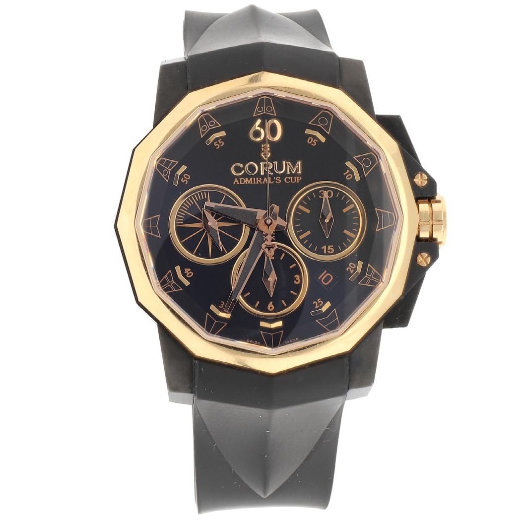 CAJA 44 MM ORO ROSA, PULSO CAUCHO, BISEL OCTOGONAL CERÁMICA NEGRA, CARÁTULA MARRÓN CON MÉGA TAPISSERIE SIN CIFRAS, TRES SUBESFERAS MOV. AUTOMÁTICO NO. AM7783, COMPLICACIONES: CRONÓGRAFO, FECHADOR, RESERVA DE MARCHA 50 HORAS, SERIE K58XXX, CAL: AP 3126, JOYAS 59, GRS. 235.2, CON EXTRACTO DE ARCHIVOS A.P. EDO. DE CONSERVACIÓN: MUY BUENO