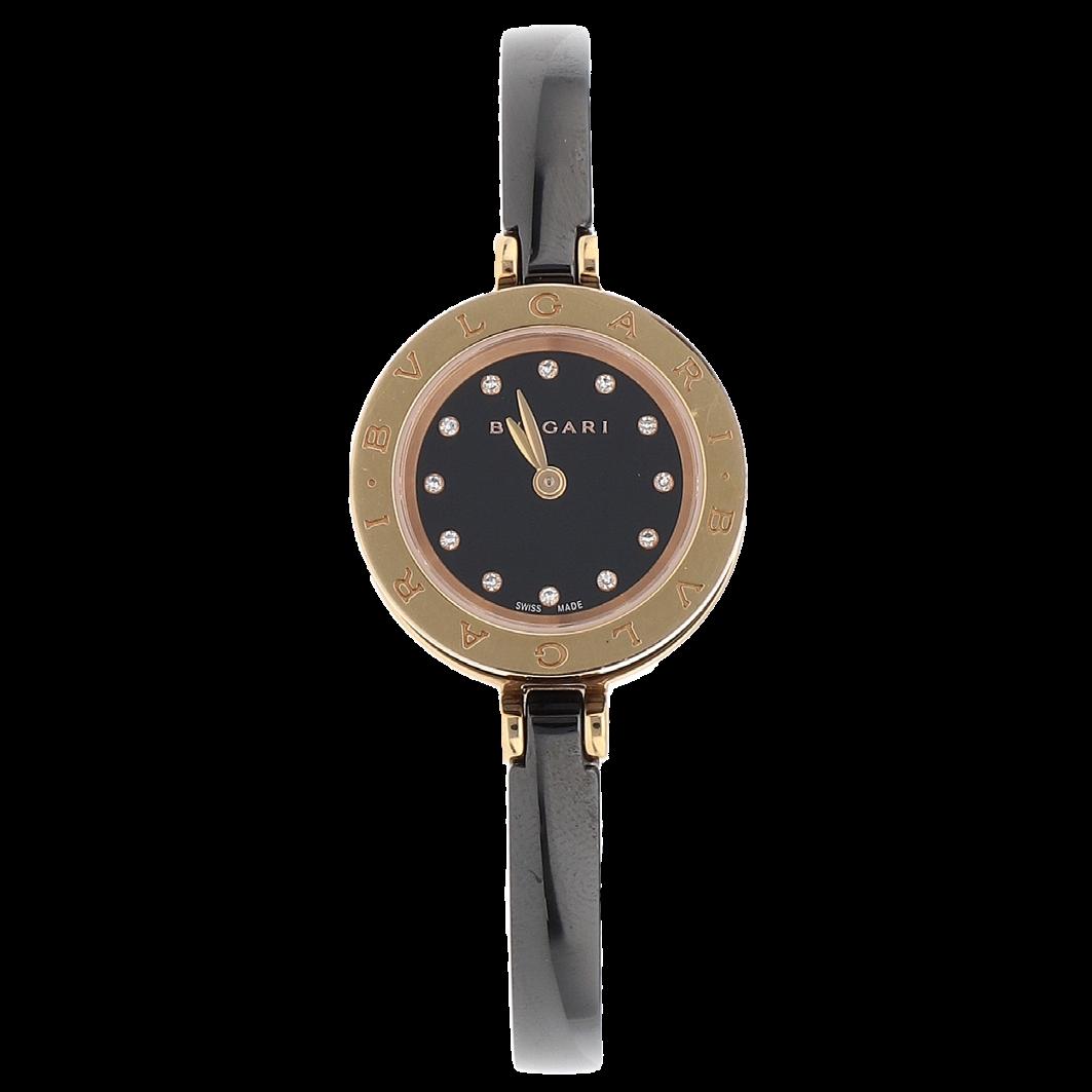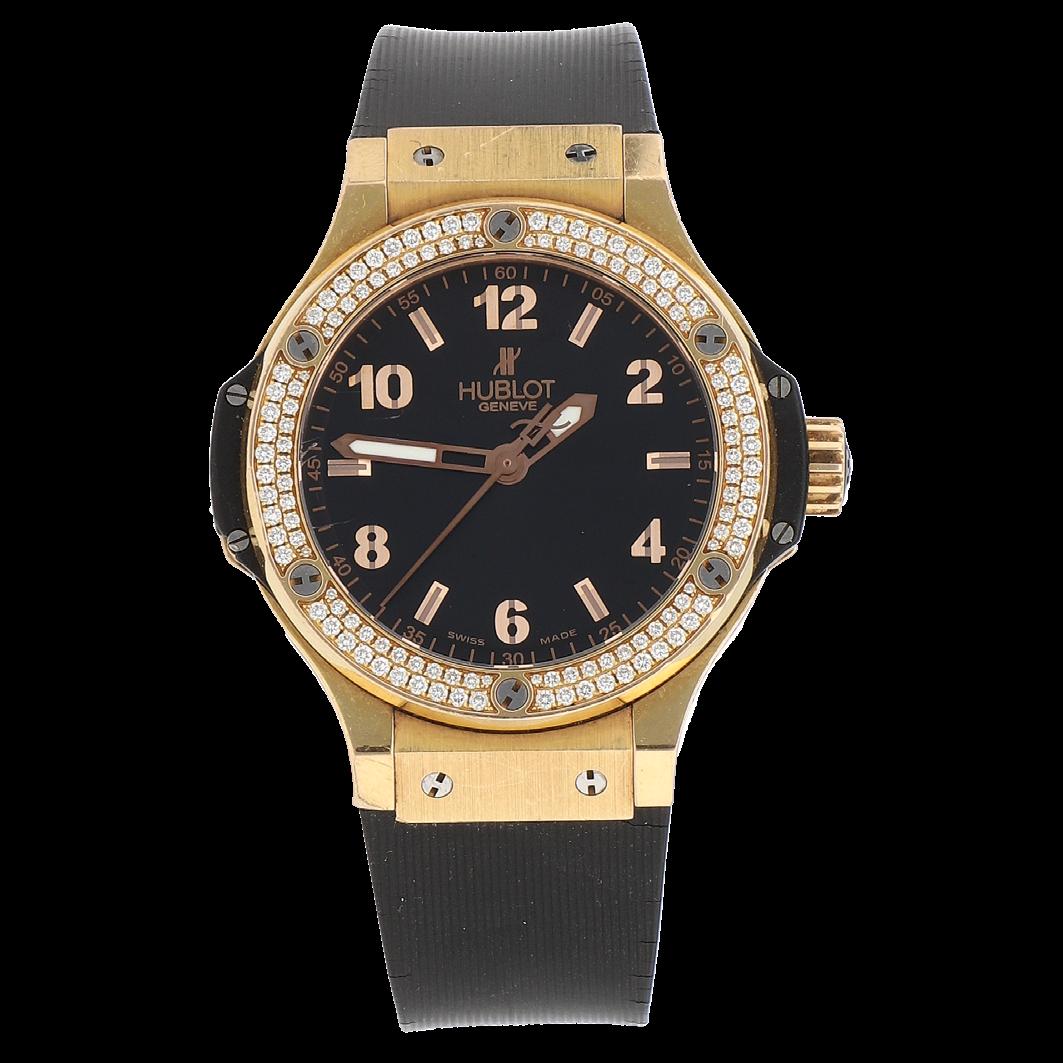 CAJA 38 MM EN ORO ROSA, BISEL CON 2 CERCOS DE BRILLANTES, PULSO CAUCHO (AGRIETADO) CARÁTULA NEGRA, NÚMEROS ARÁBIGOS, MOVIMIENTO CUARZO, SERIE 748XXX, CALIBRE 955.112, JOYAS 7, GRAMOS 116.5, ESTADO DE CONSERVACIÓN SATISFACTORIO