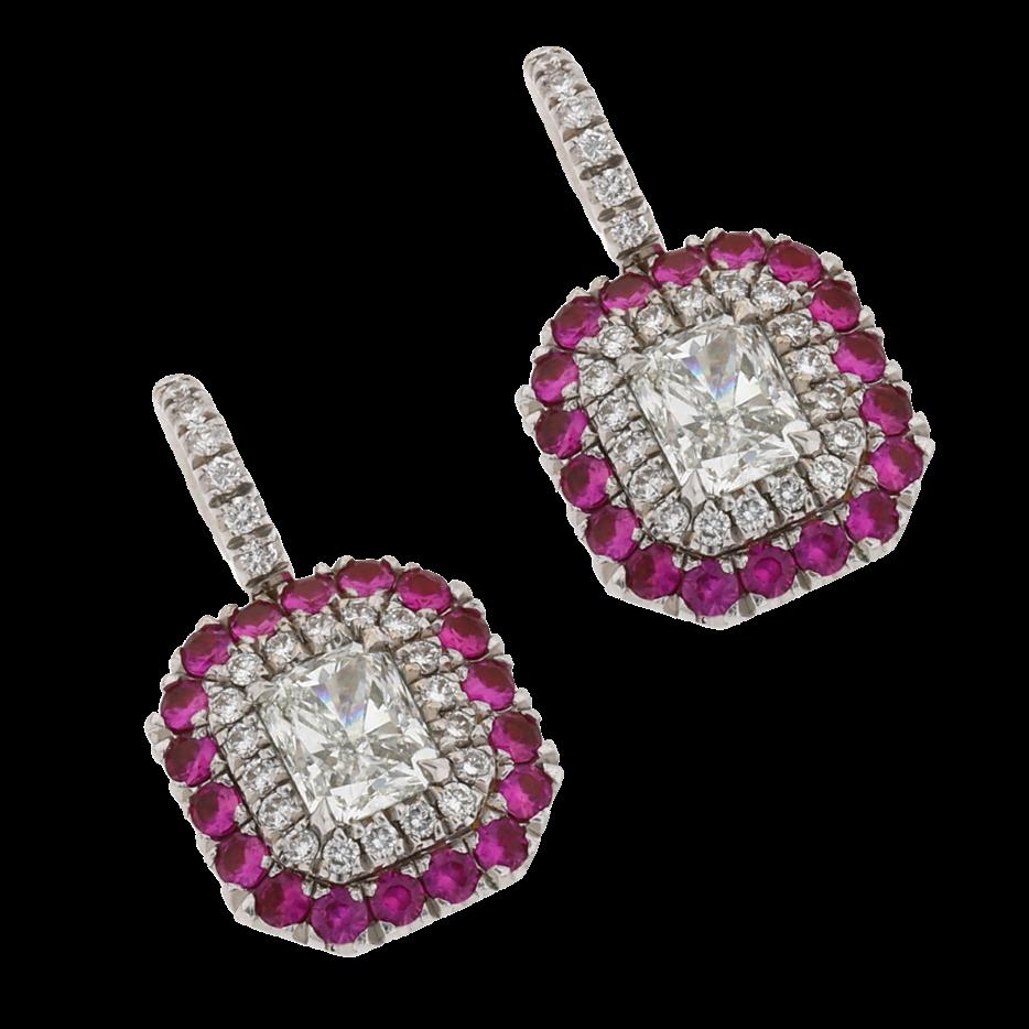 CONFECCIONADOS ORO BLANCO 18K 2 DIAMANTES PRINCESS 1.80 CTW (2X0.90) VS/I-J. CERCO DIAMANTES MELEE 1.0 CTW Y RUBIES MELEE 0.80 CTW. GRS 7.1 CALIDAD Y PESOS APROXIMADOS