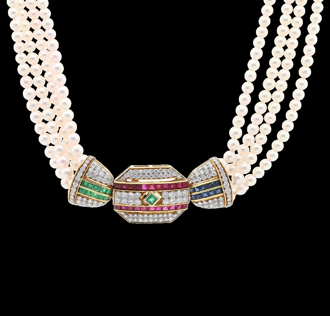 CONGECCIONADO CON 4 HILOS DE PERLAS DE 3.95-4.38 MM, CON BRECHE ORO AMARILLO 18K, BRILLANTES MELEE 3.86