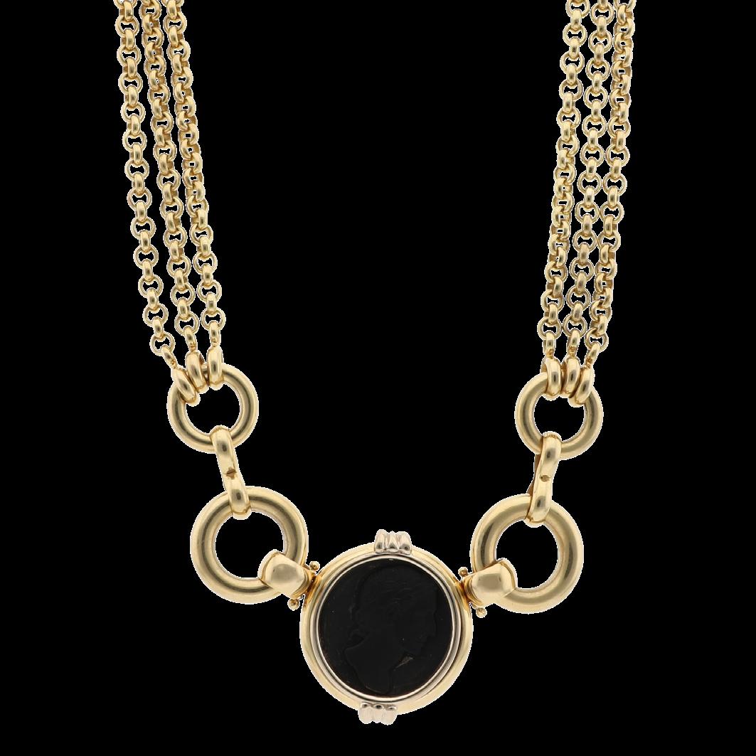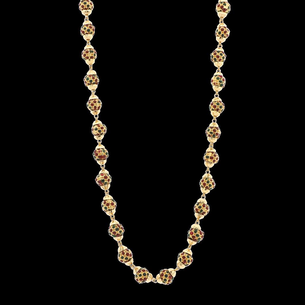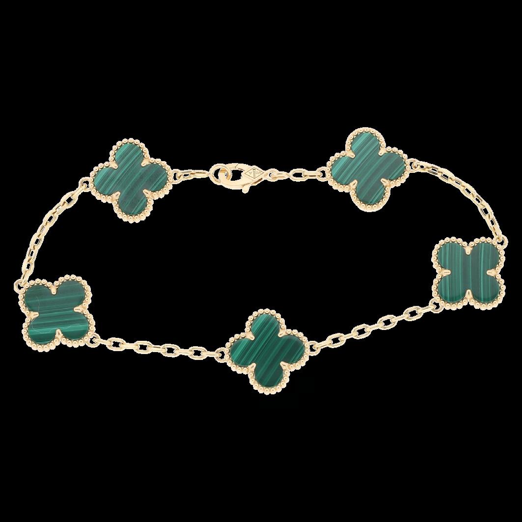 CONFECCIONADA EN ORO AMARILLO 18K CON 5 MOTIVOS CUATRIFOLIO CON MALAQUITAS. LONGITUD 17.0. GRS 10.1 CALIDAD Y PESOS APROXIMADOS