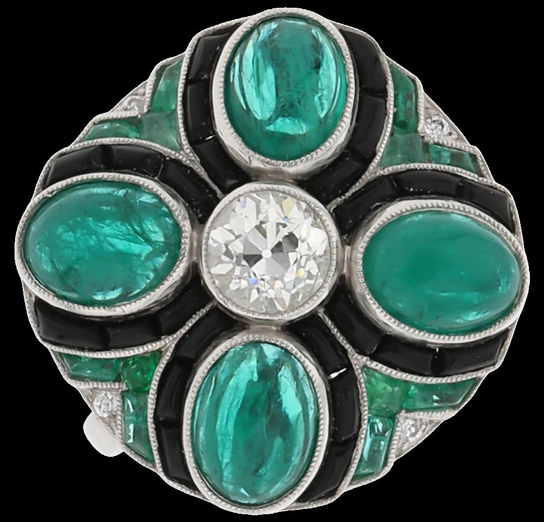 CONFECCIONADO EN PLATINO CON ESMERALDAS CABUJÓN OVAL 3.12 CTW. DIAMANTE CENTRAL CORTE ANTIGUO 0.69 CTS VS/G-H. DIAMANTES MELEE0.10 CTW. GRS 10.3. CALIDAD Y PESOS APROXIMADOS
