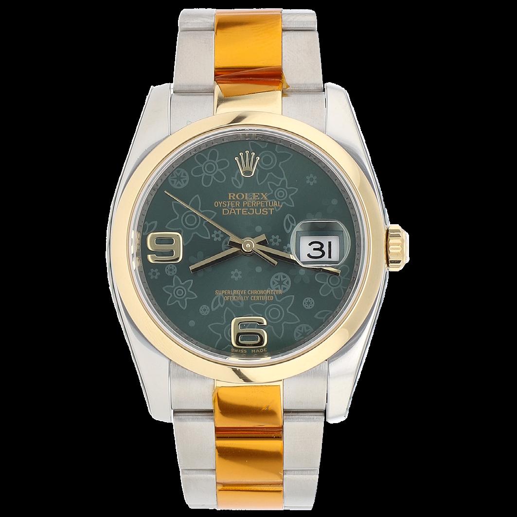 CAJA 36 MM Y PULSO OYSTER EN ACERO Y ORO, CARATULA VERDE MOTIVOS FLORALES INDICADORES MIXTOS, MOVIMIENTO AUTOMÁTICO, FUNCIÓN: FECHADOR, SERIE 116203, CALIBRE 3135, NO. DE MAQUINARIA 3 3576152, JOYAS 31, GRAMOS 128.4, ESTADO DE CONSERVACIÓN SATISFACTORIO, CON TARJETA DE GARNATIA ROLEX HASTA SEPTIEMBRE DEL 2027