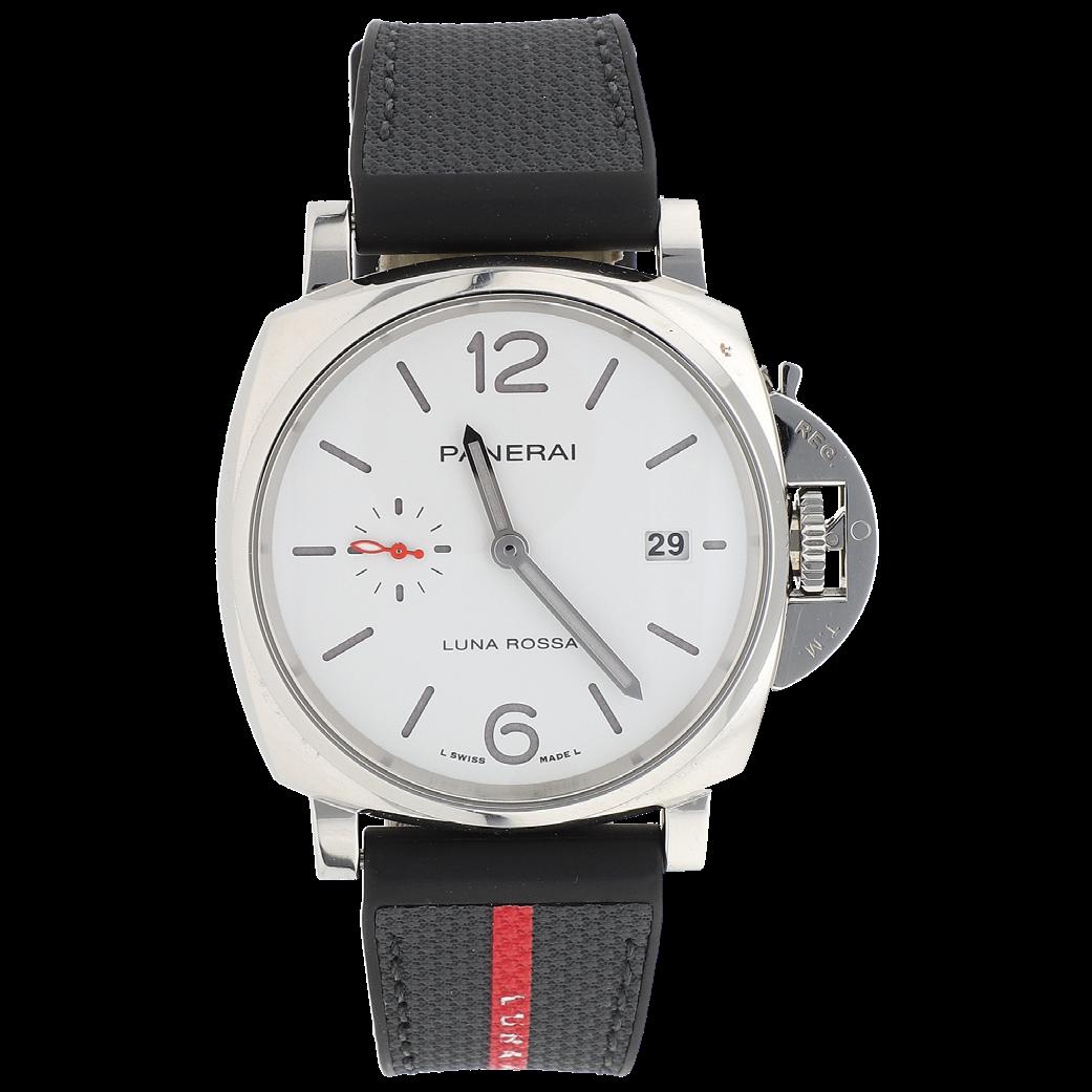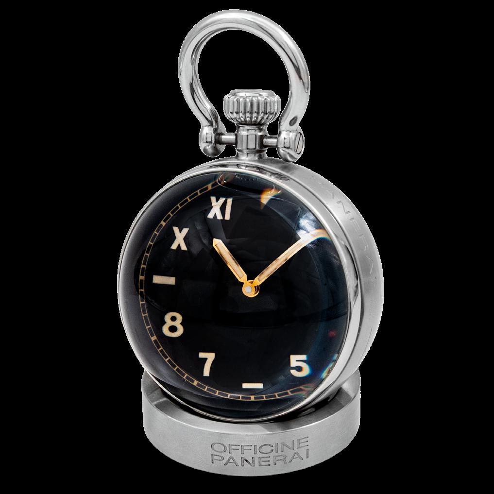 RELOJ DE MESA “PANERAI” MODELO TABLE CLOCK REF. PAM 00651. FECHA APROX. PRODUCCIÓN 2020 DIÁMETRO 65 MM DE ACERO, CARÁTULA NEGRA CON INDICADORES MIXTOS, MOV. CUERDA MANUAL NO. 030230, RESERVA DE MARCHA 8 DÍAS, SERIE AN 0004XXX, CALIBRE P.5000, JOYAS 21, GRAMOS 530.8 EDO. CONSERVACIÓN SATISFACTORIO (FALTA TORNILLO)