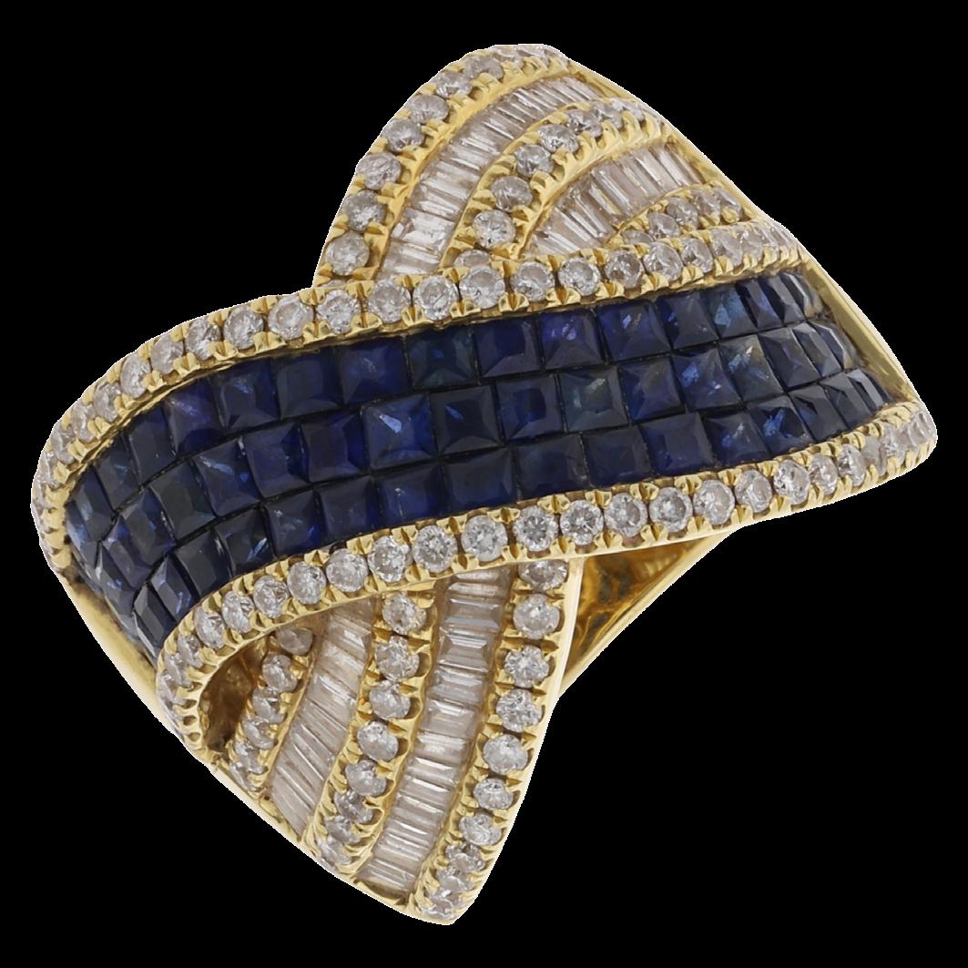 CONFECCIONADA EN ORO AMARILLO 18K, CON BRILLANTES MELEE 5.20 CTW, PEQUEÑO ZAFIRO EN OJO, CMS. 60.0, GRAMOS 109.5, CALIDAD Y PESOS APROXIMADOS