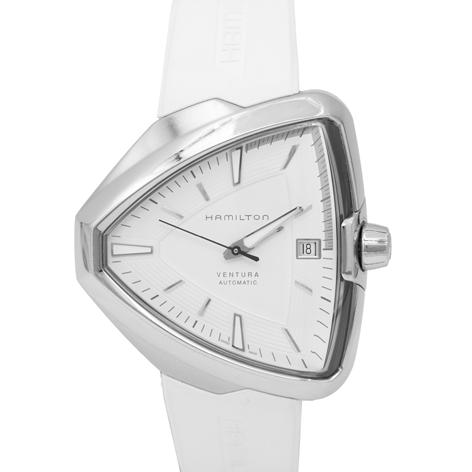 reloj unIsex “HamIlton” *ventura elvIs 80* ref H24505311 caja 42x45 mm en acero, Pulso caucHo blanco, carátula blanca, sIn cIfras, mov aut, comPlIcacIones: fecHaDor, serIe 82463Pxxx calIbre H-10 y c07.611. joyas 25. eDo De cons: satIsfactorIo