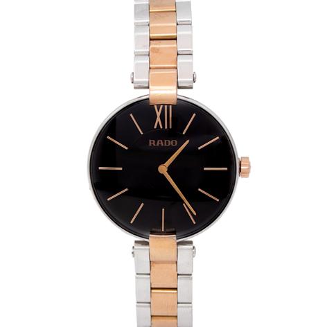 reloj Para Dama “raDo” *couPole* referencIa r22850163 y/o 278.3850.4 caja 33 mm y Pulso acero y acero PvD rosa, carátula negra, sIn cIfras, mov cuarzo, serIe 3345xxx, calIbre e61 031, joyas 8, gramos 75.4, eDo De cons: satIsfactorIo
