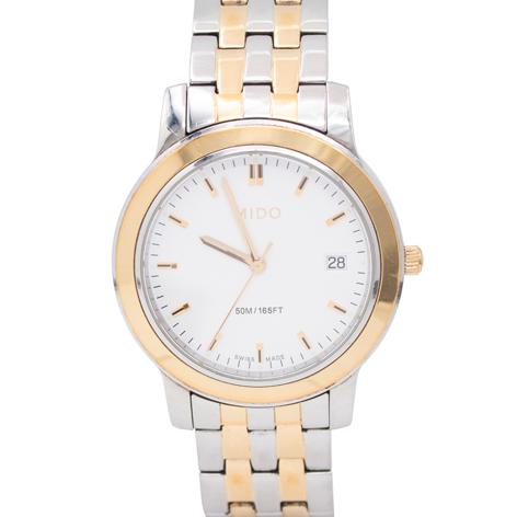 reloj Para caballero “mIDo” *maDIson* ref m2966.9.16.1 caja 38 mm y Pulso acero y acero DoraDo, carátula blanca, sIn cIfras, mov cuarzo, comPlIcacIón: fecHaDor, serIe 10bc0977xxx, calIbre f06.111, joyas 3, gramos 97.5, eDo De cons: satIsfactorIo