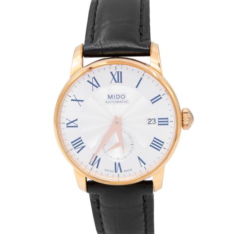 reloj Para caballero “mIDo” *baroncellI II* referencIa m8608 a caja 38 mm en acero DoraDo, Pulso PIel, carátula PlateaDa, números romanos, mov aut, comPlIcacIones: fecHaDor, segunDero subsIDIarIo, serIe 14bg0051xxx, calIbre 2825-2, joyas 25, eDo De cons: satIsfactorIo